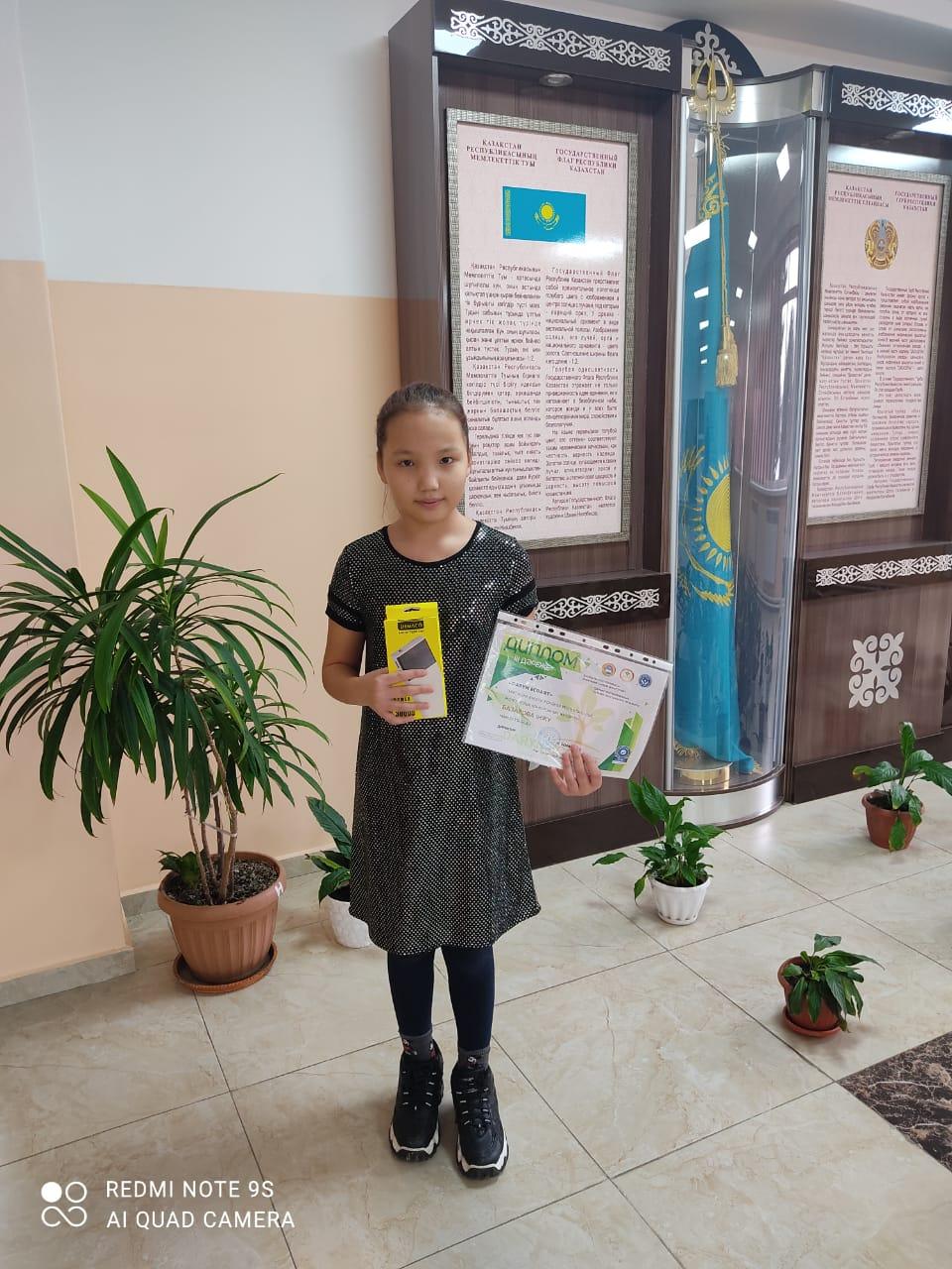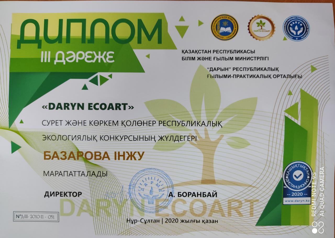 Мектебіміздің 5 Г сынып оқушысы Базарова Інжу "Дарын" Республикалық ғылыми-практикалық орталығы, "DARYN ECOART" сурет және қолөнер Республикалық экологиялық конкурсының ІІІ дәрежелі дипломымен марапатталды. Жетекшісі Алжанбаева Нұрбану