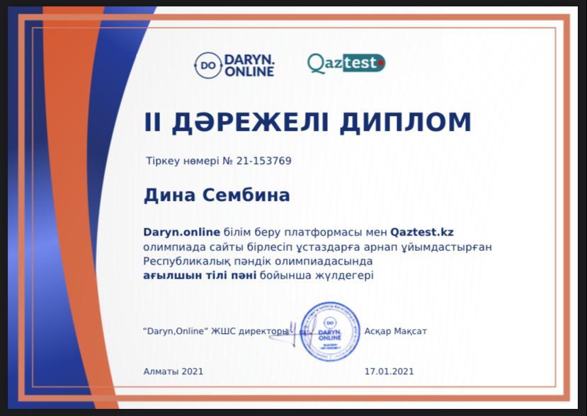 Мектебіміздің ағылшын тілі мұғалімі Сембина Дина Daryn.online білім беру платформасы мен Qaztest.kz олимпиада сайты бірлесіп ұстаздарға арнап ұйымдастырған Республикалық пәндік олимпиадасында ағылшын тілі пәні бойынша ІІ дәрежелі дипломымен марапатталды