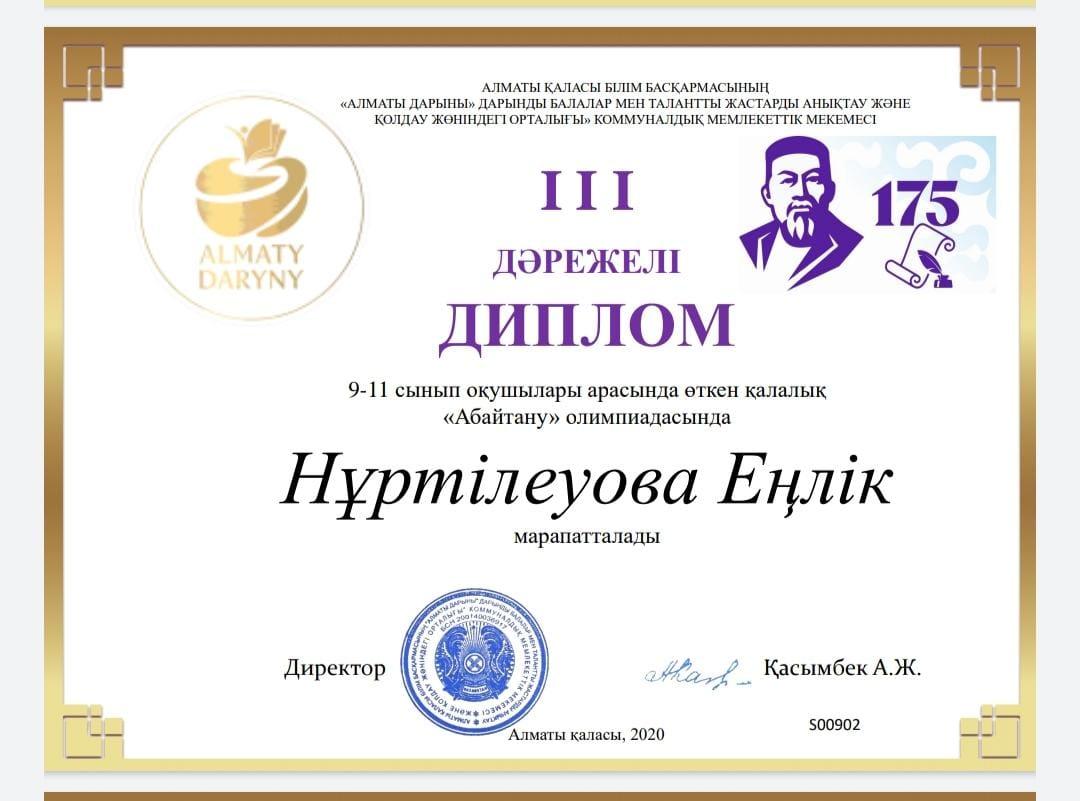 22 январь 2021 0 1 2 3 4 5 ALMATY DARYNY Алматы қаласы Жетісу ауданы, Сүйінбай атындағы №143МЛ 9-сынып оқушысы Нұртілеуова Еңлік 9-11 сынып оқушылары арасында өткен қалалық "Абайтану" олимпиадасына қатысып, жүлделі IІІ орынға ие болды. Жетекшісі Сейілбекова Г.Қ. Құттықтаймыз! Осы беттің QR-коды:QR-код этой страницы: