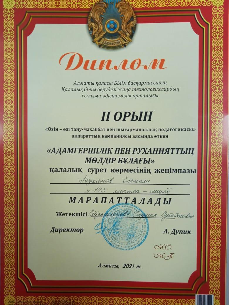 "Өзін-өзі тану - махаббат пен шығармашылық педагогикасы" ақпараттық компаниясы аясында өткен "АДАМГЕРШІЛІК ПЕН РУХАНИЯТТЫҢ МӨЛДІР БҰЛАҒЫ" қалалық сурет көрмесінің жеңімпазы Сүйінбай атындағы #143 мектеп-лицейдің 7 "Г" сынып оқушысы Абуканов Есенали ІІ дәрежелі дипломмен марапатталды. Жетекшісі Сейдахметова Раушан