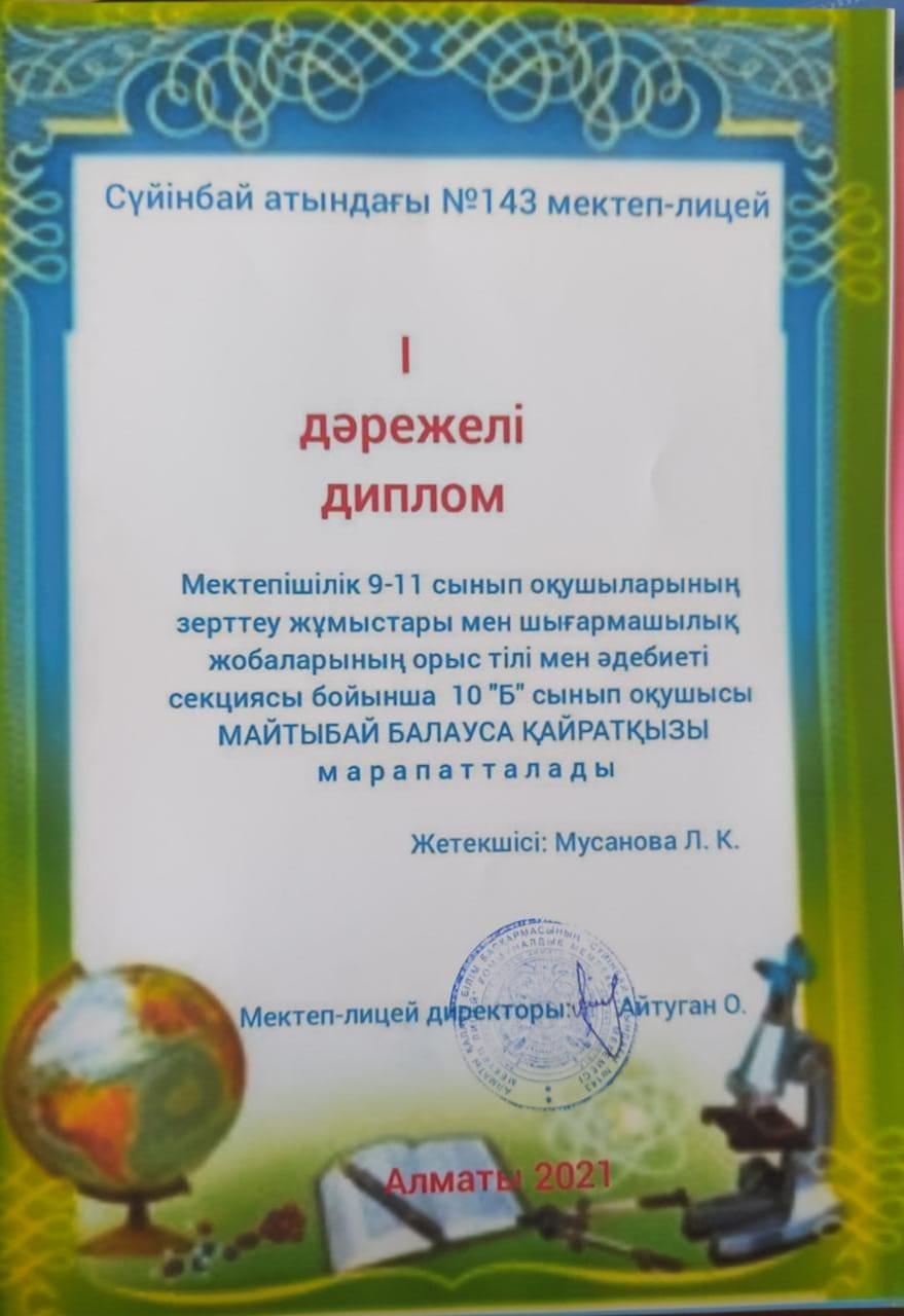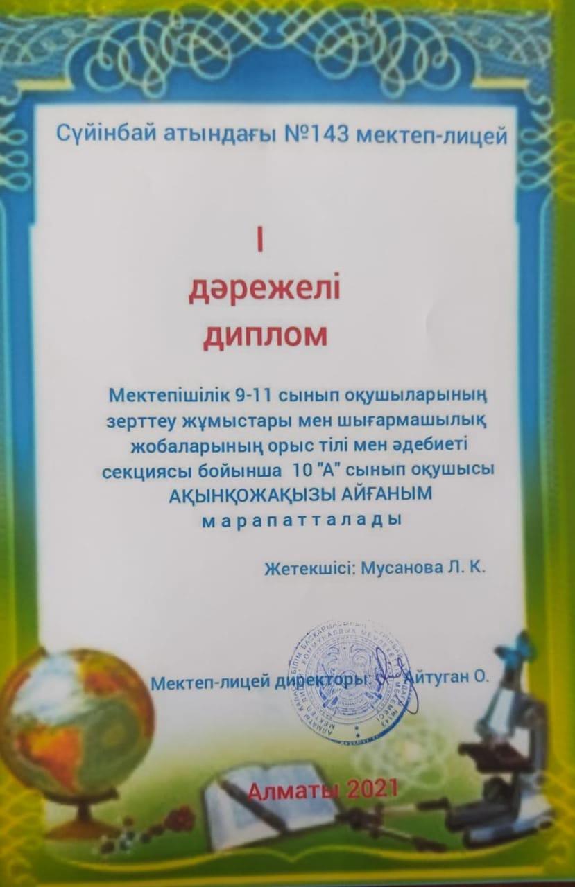 Сүйінбай атындағы #143 мектеп-лицейдің 10"Б" сынып оқушысы Майтыбай Балауса, 10"А" сынып оқушысы Ақынқожақызы Айғаным, мектепішілік 9-11 сынып оқушыларының зерттеу жұмыстары мен шығармашылық жобаларының орыс тілі мен әдебиеті секциясы бойынша І дәрежелі дипломымен марапатталды. Жетекшісі Мусанова Ляззат