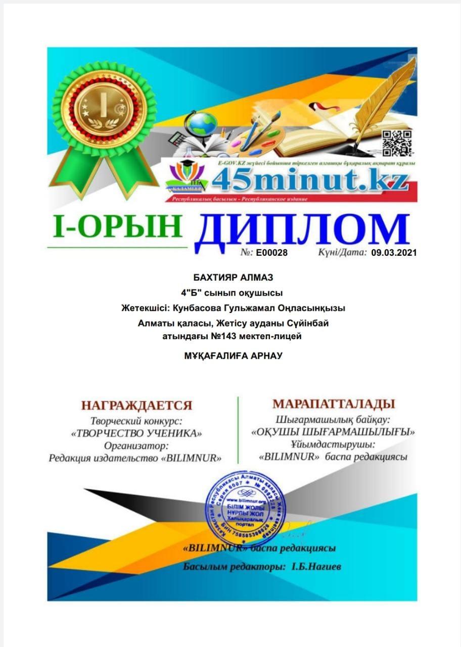 "BILIMNUR" баспа редакциясының ұйымдастыруымен өткен Мұқағали Мақатаевтың 90 жылдығына орай Сүйінбай атындағы #143 мектеп-лицейдің 4"Б" сынып оқушысы Бахтияр Алмаз МҰҚАҒАЛИҒА АРНАУ номинациясы бойынша І орын дипломымен марапатталды. Жетекшісі Кунбасова Гульжамал