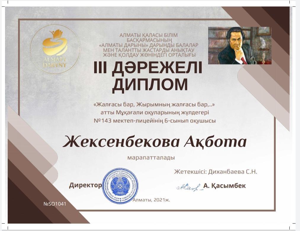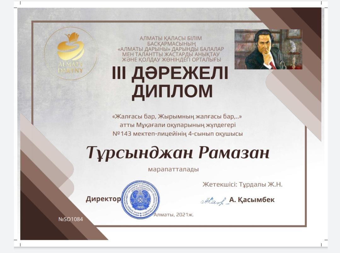 Алматы қаласы Білім басқармасының "Алматы дарыны" дарынды балалар мен талантты жастарды анықтау және қолдау жөніндегі орталығы ұйымдастырған "Жалғасы бар, Жырының жалғасы бар,..." атты Мұқағали оқуларының жүлдегерлері Сүйінбай атындағы #143 мектеп-лицейдің 4 "В" сынып оқушысы Тұрсынджан Рамазан ІІІ дәрежелі, 6"Б" сынып оқушысы Жексенбекова Ақбота ІІІ дәрежелі, 3"А" сынып оқушысы Баянай Айзере ІІІ дәрежелі, мектепалды даярлық тобының оқушылары Ауғанбай Әбілмансұр ІІ дәрежелі, Баянай Мұхамеджан І дәрежелі дипломымен марапатталды.