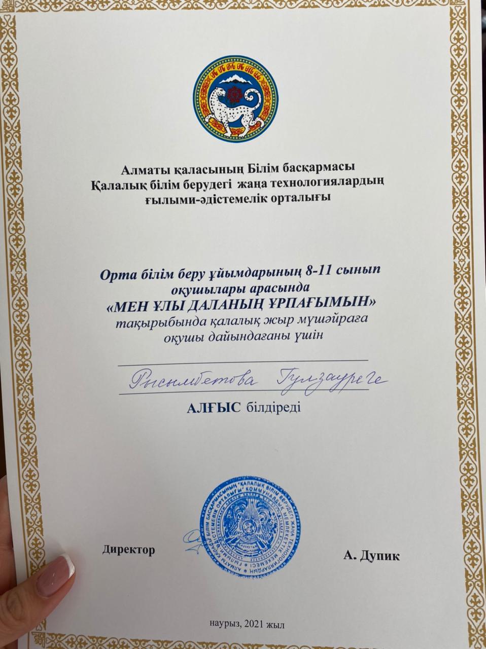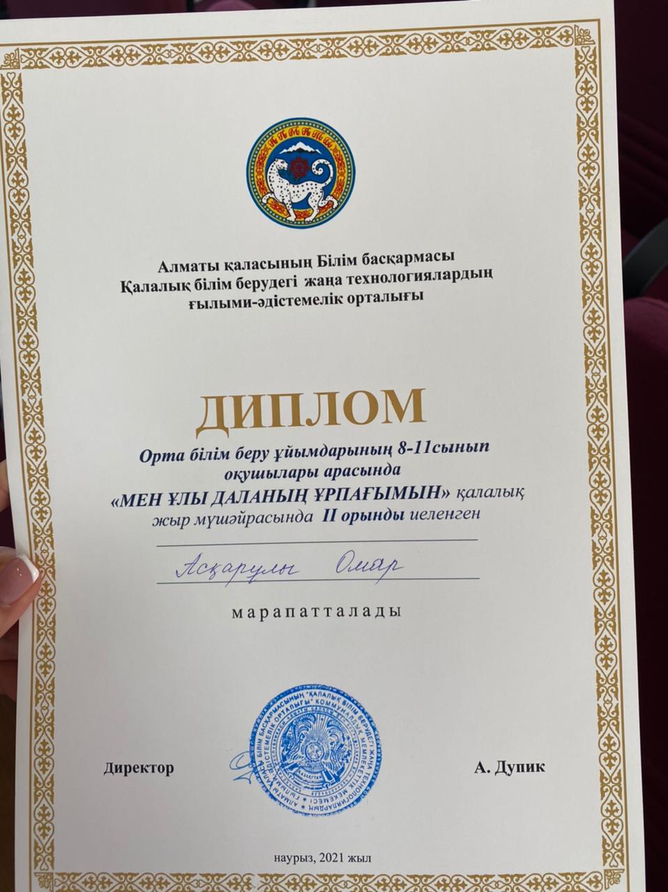 Сүйінбай атындағы #143 мектеп-лицейдің 10"А" сынып оқушысы Асқарұлы Омар орта білім беру ұйымдарының 8-11 сынып оқушылары арасында "МЕН ҰЛЫ ДАЛАНЫҢ ҰРПАҒЫМЫН" қалалық жыр мүшәйрасында ІІ орынды иеленгені үшін дипломмен және осы байқауда оқушы дайындағаны үшін қазақ тілі мен әдебиеті пәнінің мұғалімі Рысымбетова Гүлзәуре Алғыспен марапатталды.