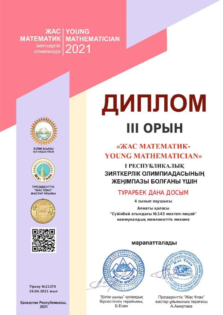 "ЖАС МАТЕМАТИК - YOUNG MATHEMATICIAN" І Республикалық зияткерлік олимпиадасының жеңімпазы болғаны үшін Сүйінбай атындағы №143 мектеп-лицейдің 4 "Б" сынып оқушылары Бахтияр Алмаз, Тұрарбек Дана ІІІ орын дипломымен және осы олимпиадада шәкірт шығармашылығын шыңдаудағы ерен еңбегі үшін бастауыш сынып мұғалімі Күнбасова Гүлжамал Алғыс хатпен марапатталды.