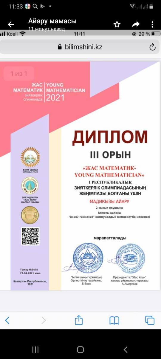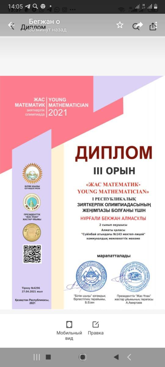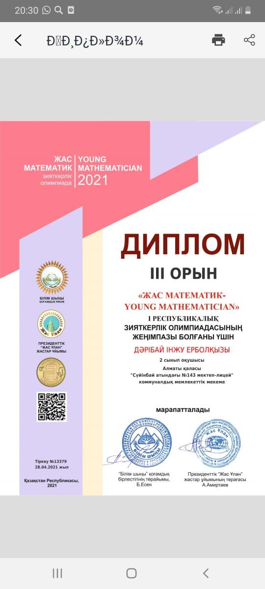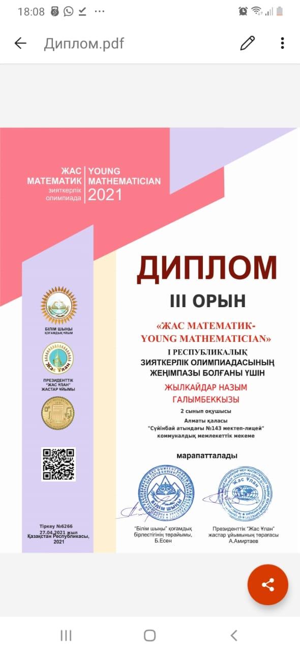 "ЖАС МАТЕМАТИК - YOUNG MATHEMATICIAN" І Республикалық зияткерлік олимпиадасының жеңімпазы болғаны үшін Сүйінбай атындағы №143 мектеп-лицейдің 2 "Ә" сынып оқушылары Дәрібай Інжу, Мадиқызы Айару, Нұрғали Бекжан, Жылқайдар Назым, Зият Зейнеп, Жұмабай Қуаныш ІІІ орын дипломымен және осы олимпиадада шәкірт шығармашылығын шыңдаудағы ерен еңбегі үшін бастауыш сынып мұғалімі Пейзова Балжан Алғыс хатпен марапатталды.