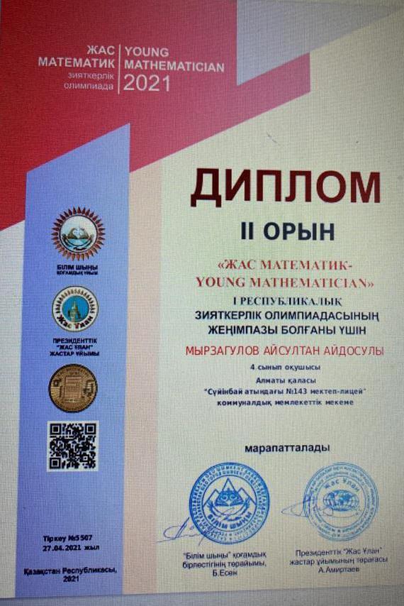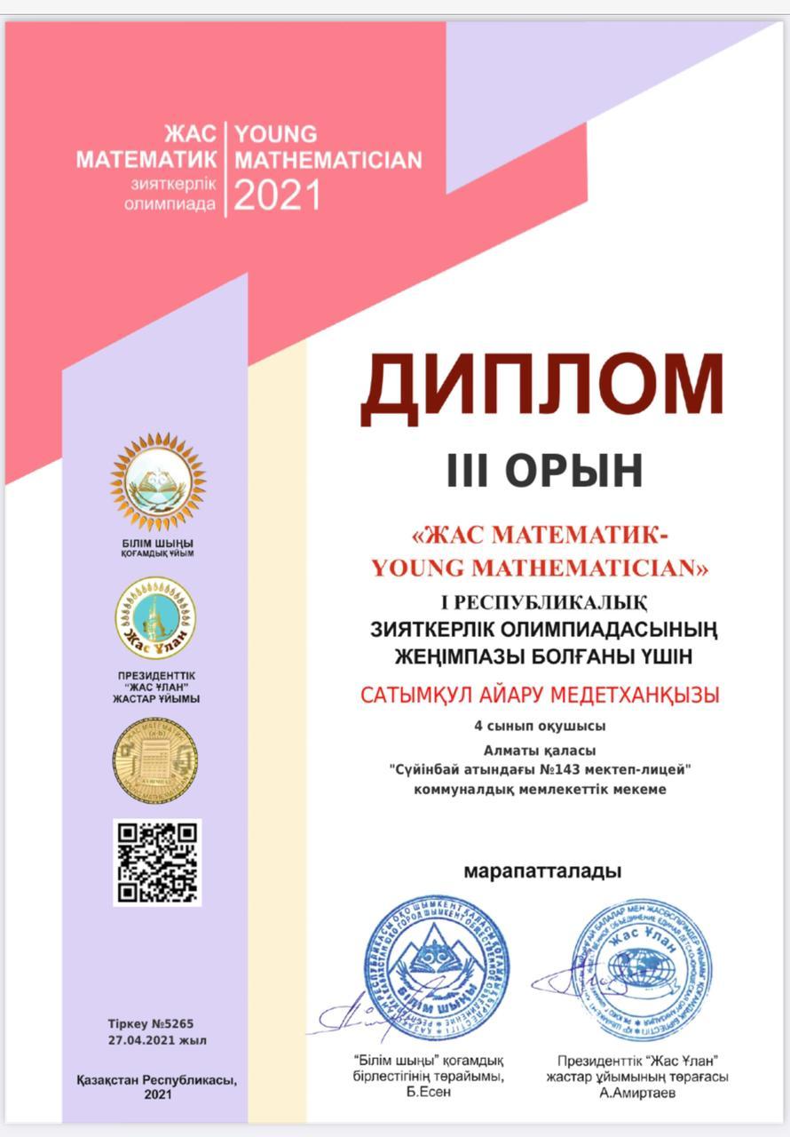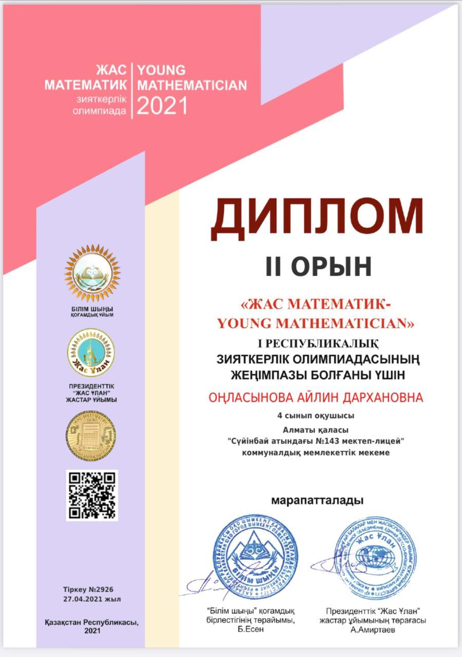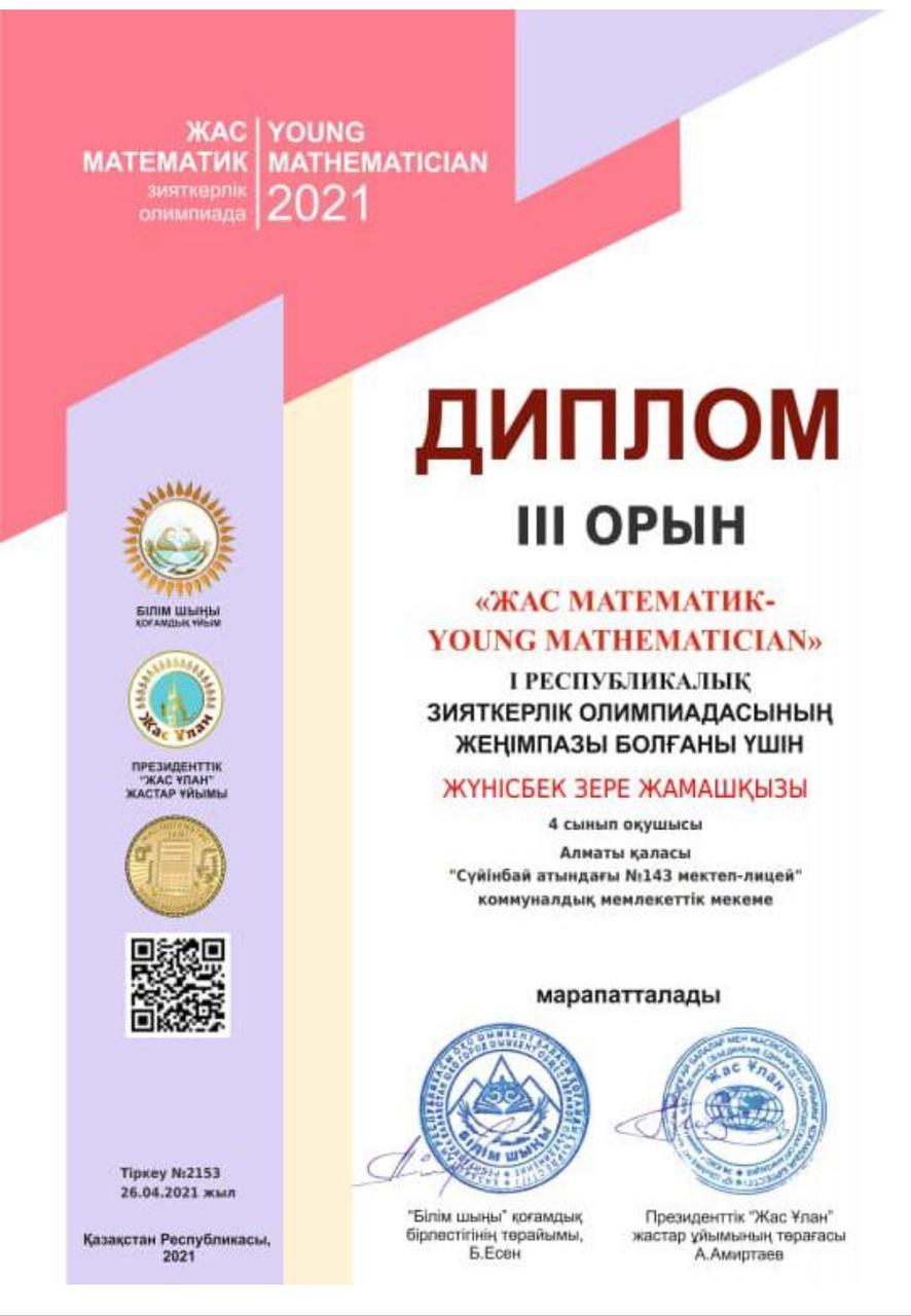 "ЖАС МАТЕМАТИК - YOUNG MATHEMATICIAN" І Республикалық зияткерлік олимпиадасының жеңімпазы болғаны үшін Сүйінбай атындағы №143 мектеп-лицейдің 4 "А" сынып оқушылары Тоқтар Нұрасыл І орын, Мырзағұлов Айсұлтан ІІ орын, Берікқара Тоғжан ІІ орын, Оңласынова Айлин ІІ орын, Сатымқұл Айару ІІІ орын, Бекзақ Бейбарыс ІІІ орын, Жүнісбек Зере ІІІ орын дипломымен марапатталды.