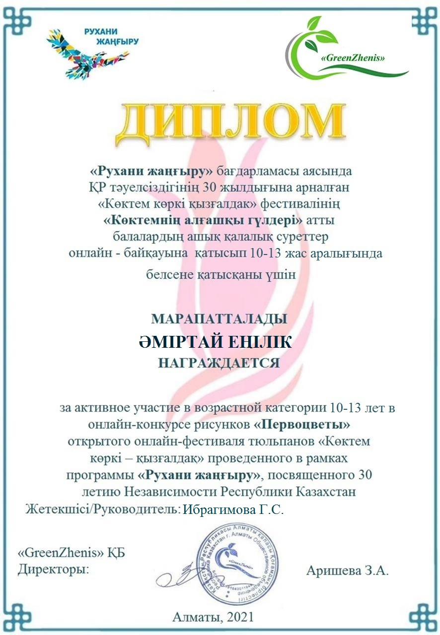 "РУХАНИ ЖАҢҒЫРУ" бағдарламасы аясында ҚР Тәуелсіздігінің 30 жылдығына арналған "Көктем көркі қызғалдақ" фестивалінің "Көктемнің алғашқы гүлдері" атты балалардың ашық қалалық суреттер онлайн байқауына қатысып 10-13 жас аралығында белсене қатысқаны үшін мектебіміздің 6"Б" сынып оқушысы Әміртай Еңлік, 5"Б" сынып оқушысы Ратан Аяла дипломмен марапатталды.