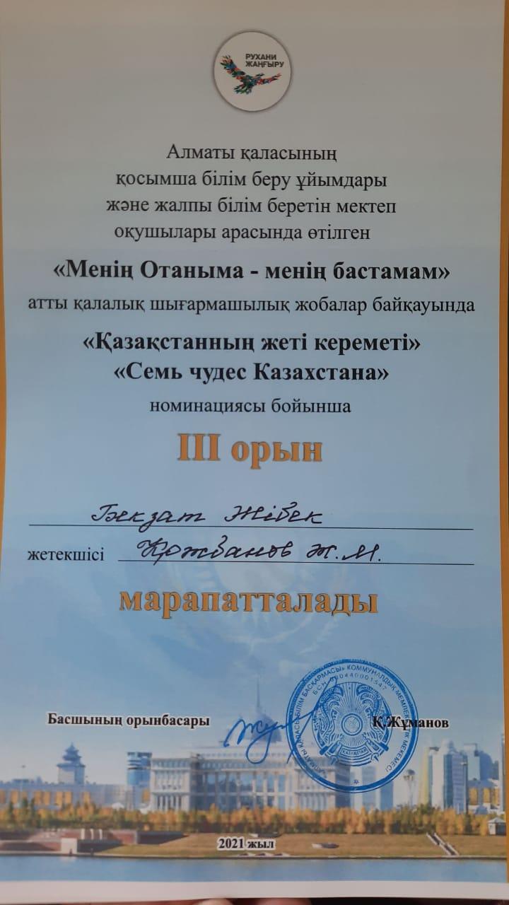 Алматы қаласының қосымша білім беру ұйымдары және жалпы білім беретін мектеп оқушылары арасында өтілген "Менің Отаным - менің бастамам" атты қалалық шығармашылық жобалар байқауында "Қазақстанның жеті кереметі" номинациясы бойынша Сүйінбай атындағы #143 мектеп-лицейдің 7 "В" сынып оқушысы Бекзат Жібек ІІІ орын дипломымен марапатталды. Жетекшісі информатика пәнінің мұғалімі Қожбанов Жұбаныш Мәлікұлы