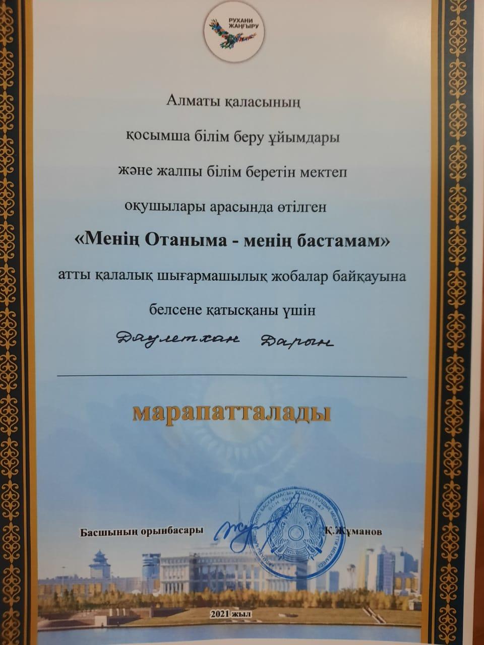 Алматы қаласының қосымша білім беру ұйымдары және жалпы білім беретін мектеп оқушылары арасында өтілген "Менің Отаным - менің бастамам" атты қалалық шығармашылық жобалар байқауына белсене қатысқаны үшін Сүйінбай атындағы #143 мектеп-лицейдің 10 "Ә" сынып оқушысы Даулетхан Дарын дипломмен марапатталды. Жетекшісі қазақ тілі және әдебиеті пәнінің мұғалімі Иманбаева Алмагүл Оралқызы