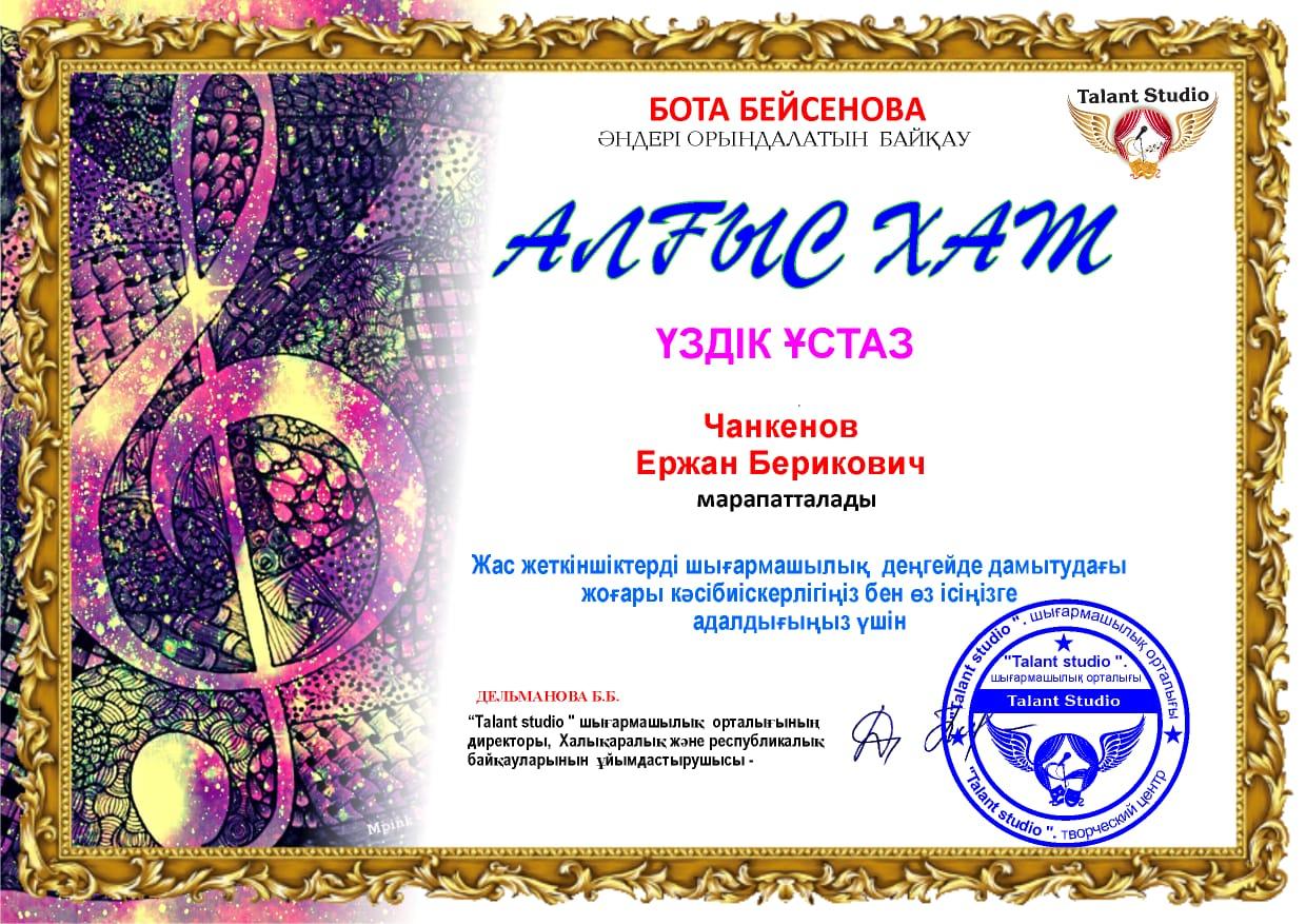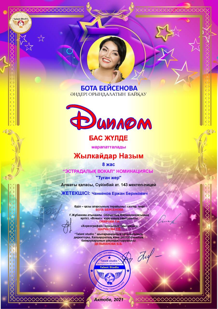 Бота Бейсенова әндері орындалатын байқауда "ЭСТРАДАЛЫҚ ВОКАЛ" номинациясы Сүйінбай атындағы #143 мектеп-лицейдің 2"Г" сынып оқушысы Жылкайдар Назым БАС ЖҮЛДЕ дипломымен марапатталды және жас жеткіншектерді шығармашылық деңгейде дамытудағы жоғары кәсібиіскерлігі үшін музыка пәнінің мұғалімі Чанкенов Ержан Берикович ҮЗДІК ҰСТАЗ Алғыс хатымен марапатталды.