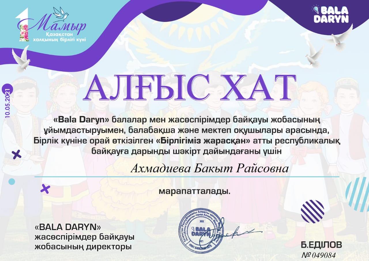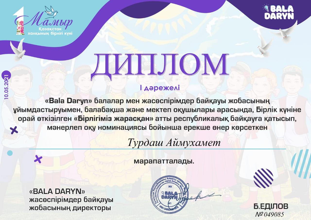 "Bala Daryn" балалар мен жасөспірімдер байқауы жобасының ұйымдастыруымен Бірлік күніне орай өткізілген "Бірлігіміз жарасқан" атты республикалық байқауға қатысып, мәнерлеп оқу номинациясы бойынша мектебіміздің 1 "А" сынып оқушысы Турдаш Аймухамет І дәрежелі диломымен және осы байқауда дарынды шәкірт дайындағаны үшін бастауыш мұғалімі Ахмадиева Бакыт Райсовна Алғыс хатмен марапатталды.