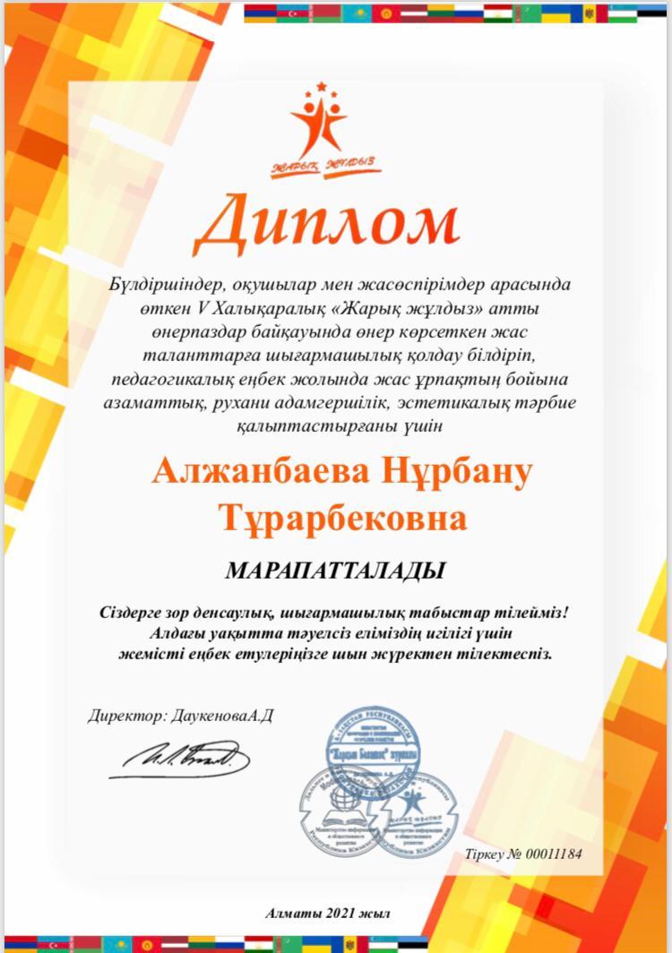 "ЖарқынБолашақ" өнер орталығы Жас өнерпаздарды қолдау мақсатында V Халықаралық "Жарық жұлдыз" балалар өнер байқауының "Көркем сурет" жанры бойынша жоғары дәрежелі өнер көрсеткені үшін 6"А" сынып оқушысы Райымбек Аяжан Даниярқызы І дәрежелі дипломымен және осы байқауда өнер көрсеткен жас таланттарға шығармашылық қолдау білдіріп, педагогикалық еңбек жолында жас ұрпақтың бойына азаматтық, рухани адамгершілік, эстетикалық тәрбие қалыптастырғаны үшін көркемеңбекпәнініңмұғалімі Алжанбаева Нұрбану Тұрарбековна дипломмен марапатталды.