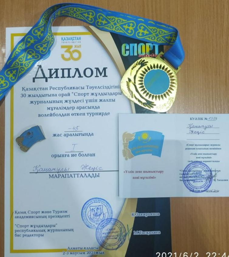 Қазақстан Республикасының Тәуелсіздігінің 30 жылдығына орай "Спорт жұлдыздары" журналының жүлдесі үшін жалпы мұғалімдер арасында волейболдан өткен турнирде Сүйінбай атындағы #143 мектеп-лицейдің дене шынықтыру пәнінің мұғалімі Қанатұлы Жеңіс І орын дипломымен және "Үздік дене шынықтыру пәні мұғалімі" куәлігі мен төсбелгісімен марапатталды. Құттықтаймыз 💐💐💐