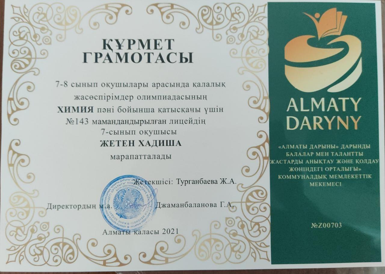 7-8 сынып оқушылары арасында қалалық жасөспірімдер олимпиадасының ХИМИЯ пәні бойынша қатысқаны үшін мектебіміздің 7 сынып оқушысы Жетен Хадиша Құрмет Грамотасымен марапатталды. Жетекшісі химия пәнінің мұғалімі Турганбаева Жанат