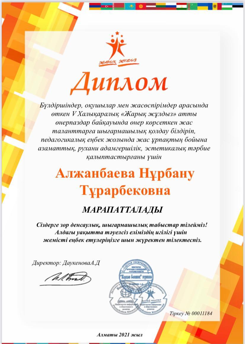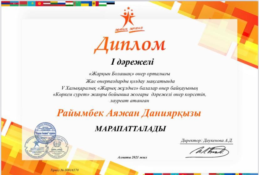 Сүйінбай атындағы №143 мектеп-лицейдің 6«а» сынып оқушысы Райымбек Аяжан Даниярқызы бүлдіршіндер,оқушылар мен жасөспірімдер арасында өткен V Халықаралық «Жарқын жұлдыз» өнерпаздар байқауына «Көркем сурет» жанры бойынша