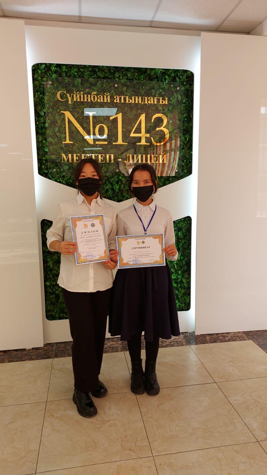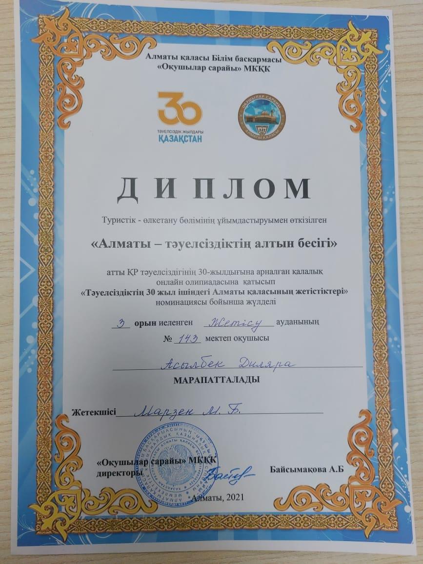 Алматы қаласы "Оқушылар сарайы" Туристік-өлкетану бөлімінің ұйымдастыруымен өткізілген "Алматы-тәуелсіздіктің алтын бесігі" атты ҚР Тәуелсіздігінің 30 жылдығына арналған қалалық онлайн олимпиадасына қатысып "Тәуелсіздіктің 30 жыл ішіндегі Алматы қаласының жетістіктері"номинациясы бойынша Жетісу ауданы №143 мектеп-лицейдің 7 "В"оқушылары Асылбек Диляра ІІІ орын дипломмен,ал Боранбаева Алмагүл сертификатпен марапатталды.Жетекшісі-Марзен Марлен.