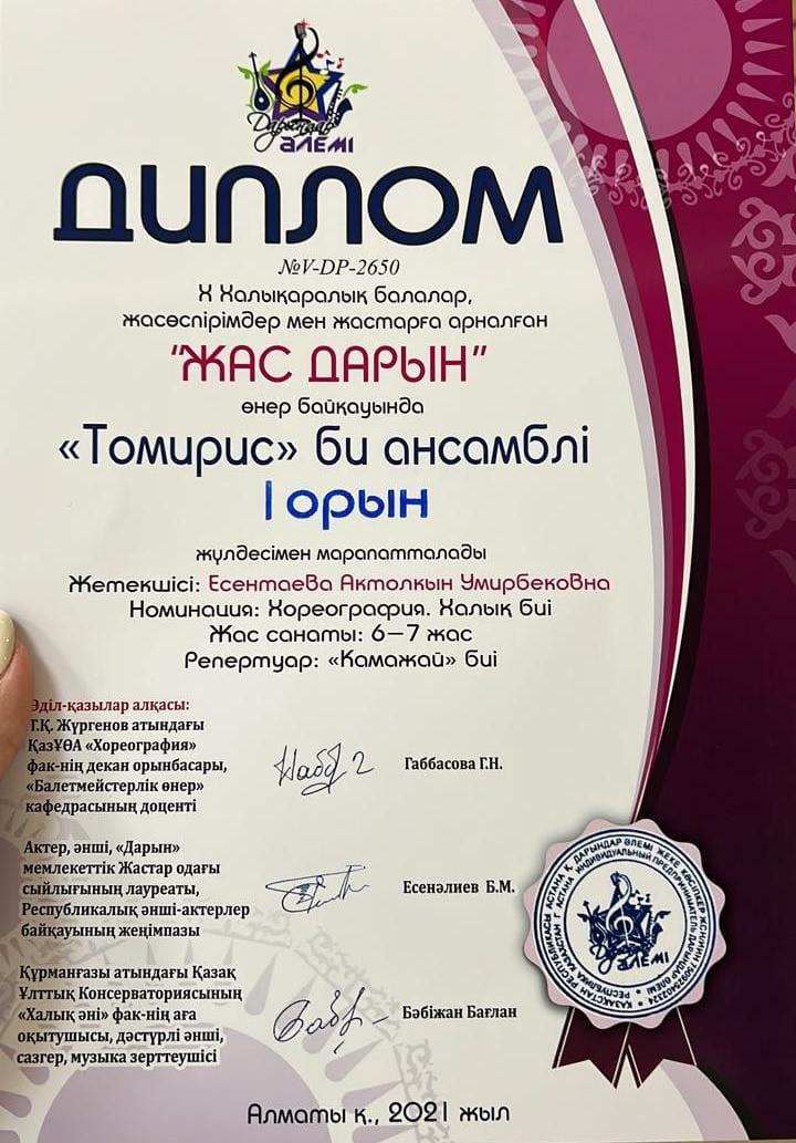 11 декабрь 2021 0 1 2 3 4 5 “ЖАС ДАРЫН” өнер байқауы X Халықаралық балалар,жасөспірімдер мен жастарға арналған “ЖАС ДАРЫН” өнер байқауында “ТОМИРИС” би ансамблі I орын алғаны үшін ДИПЛОММЕН марапатталдыЖетекшісі:Есентаева Актолкын Умирбековна Осы беттің QR-коды:QR-код этой страницы: