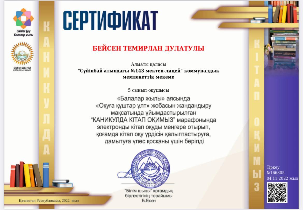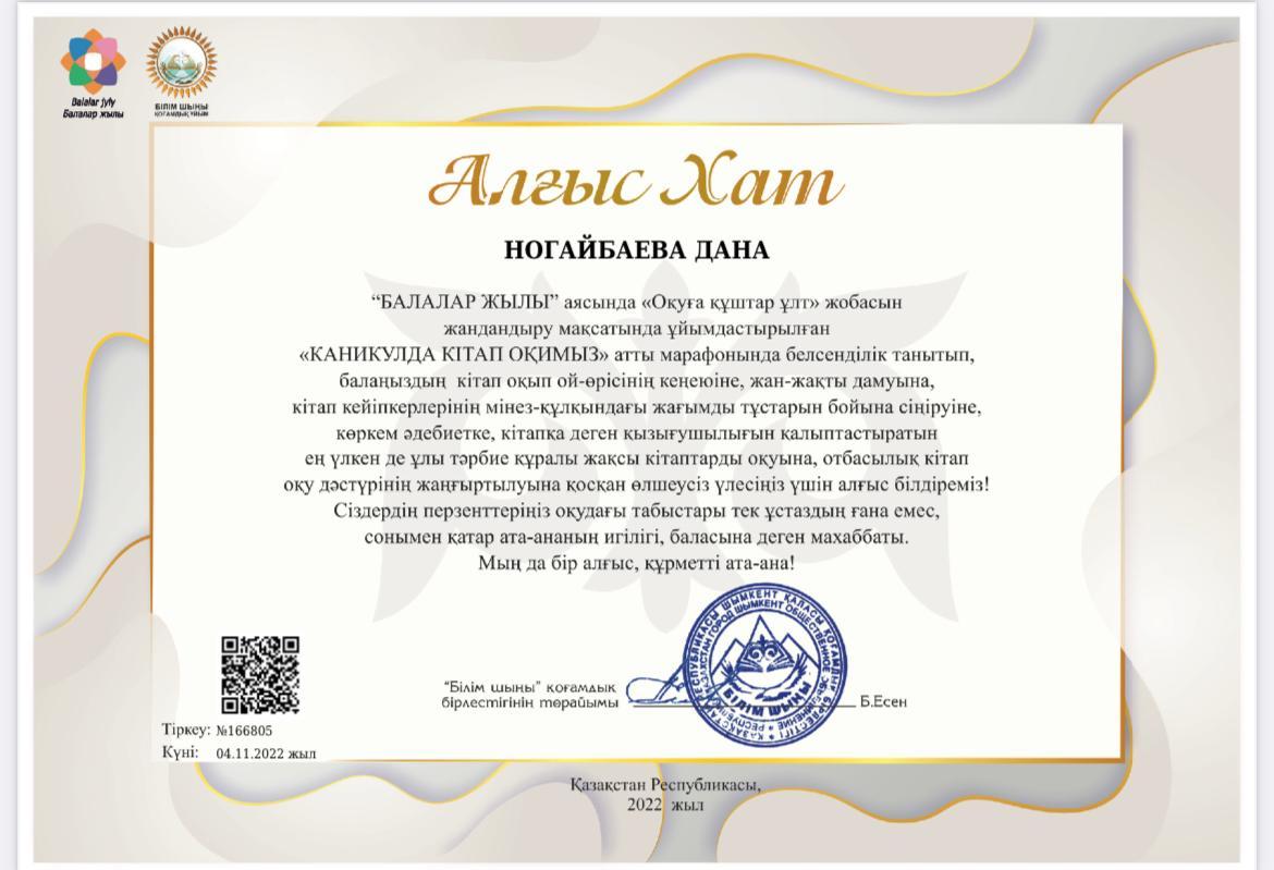 11 ноябрь 2022 0 1 2 3 4 5 "Оқуға құштар ұлт" жобасы Балалар жылы аясында "Оқуға құштар ұлт" жобасын жандандыру мақсатында ұйымдастырылған "Каникулда кітап оқимыз" марафонына белсене қатысқаны үшін 5 "Б" сынып оқушылары Ногайбаева Дана алғыс хатпен, Бейсен Темирлан сертификатпен марапатталды. Осы беттің QR-коды:QR-код этой страницы: