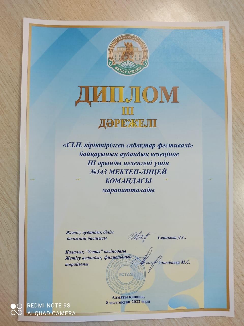 Сүйінбай атындағы №143 мектеп-лицейдің химия, биология, информатика, физика пән мұғалімдерінен құралған мектеп-лицей командасы аудандық «CLIL кіріктірілген сабақтар фестивалі» байқауына қатысып, жүлделі ІІІ орынды жеңіп алды.