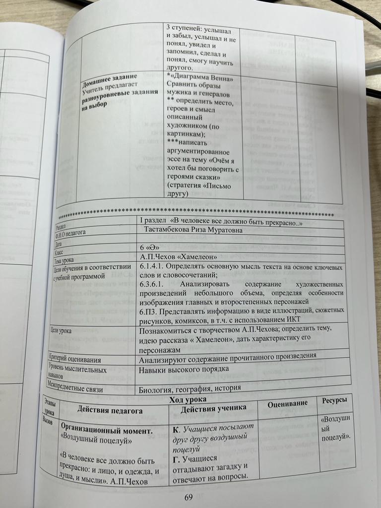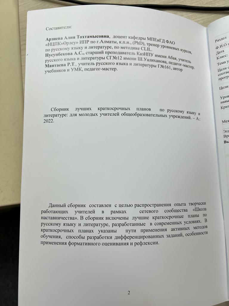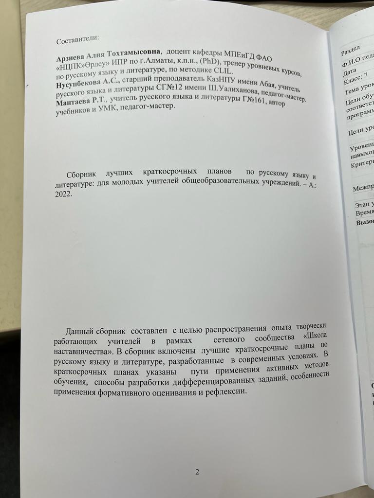 "ӨРЛЕУ" БІЛІКТІЛІКТІ АРТТЫРУ ҰЛТТЫҚ ОРТАЛЫҒЫ" АКЦИОНЕРЛІК ҚОҒАМЫНЫҢ "АЛМАТЫ ҚАЛАСЫ БОЙЫНША КӘСІБИ ДАМУ ИНСТИТУТЫ" филиалы ұйымдастыруымен орыс тілі мен әдебиеті пәні бойынша тәлімгер ұстаздардың ҮЗДІК қысқа мерзімді жоспарларының жинағында №143 Сүйінбай атындағы мектеп-лицейдің орыс тілі мен әдебиеті пәнінің мұғалімі Тастамбекова Риза Муратовнаның сабақ жоспары жарық көрді. Әріптесімізге шығармашылық табыстар тілейміз!