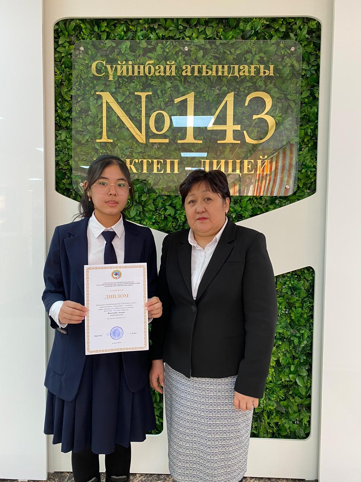 Қазақстан Республикасының Тәуелсіздігі күніне орай өткізілген “Тәуелсіздік - ел тірегі” атты қалалық эссе байқауының жүлдегері Сүйінбай атындағы №143 мектеп-лицейдің 10 сынып оқушы Жексенбек Ақжан ІІ дәрежелі дипломмен марапатталды. Пән мұғалімі: Мыңбаева Айнаш