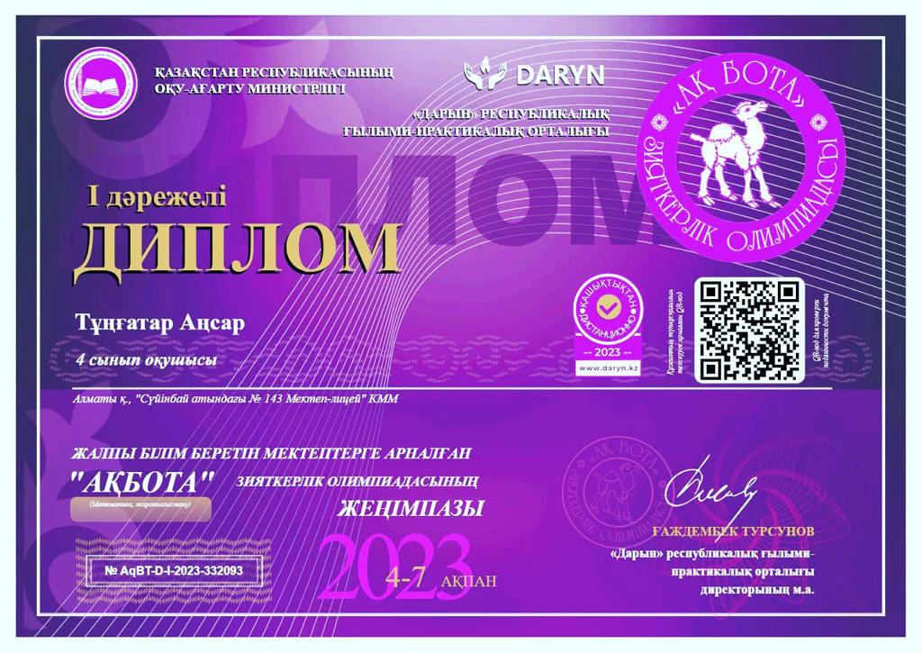 "АҚБОТА" зияткерлік олимпиадасының жеңімпаздары Сүйінбай атындағы #143 мектеп-лицейінің 4"В" сынып оқушылары Тұңғатар Аңсары І дәрежелі дипломымен, Диханбай Алькей ІІІ дәрежелі дипломымен марапатталды. Бастауыш сынып мұғалімі Қайырбекова Ұлбосын