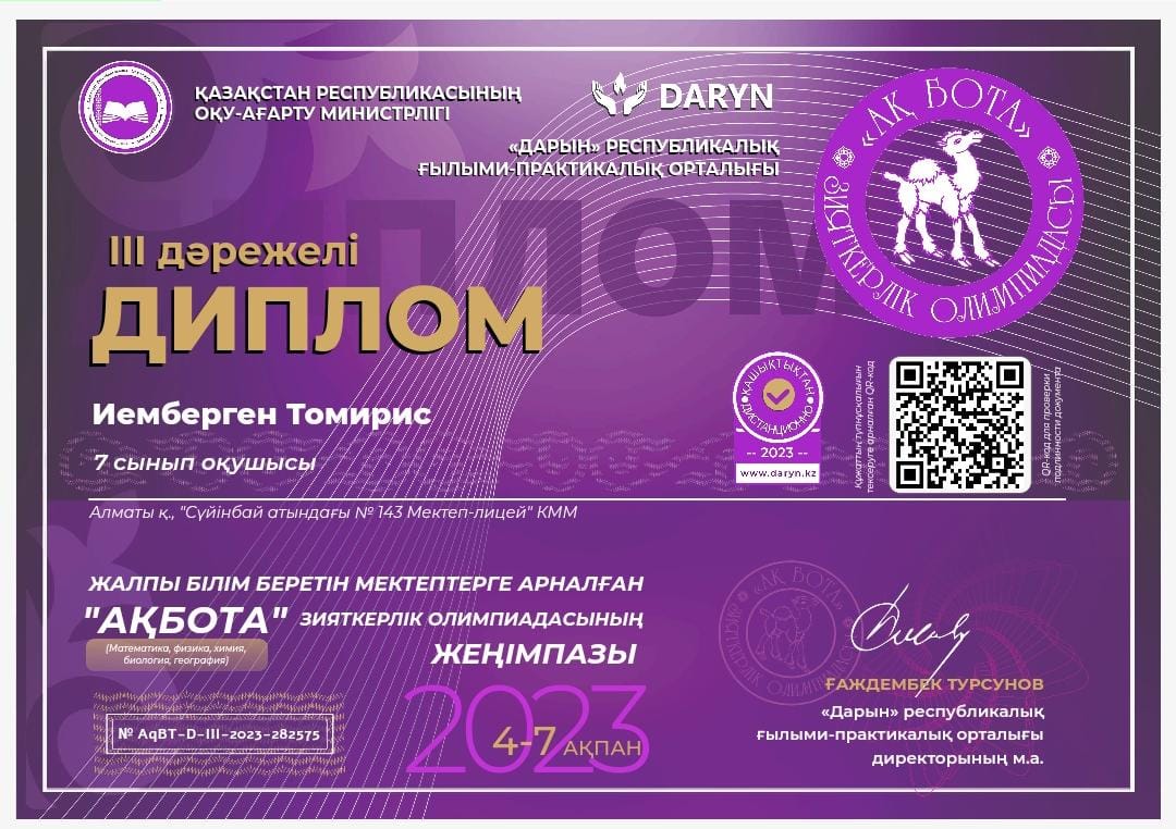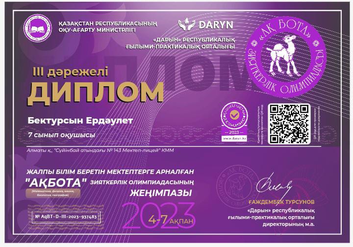 "АҚБОТА" зияткерлік олимпиадасының жеңімпаздары Сүйінбай атындағы №143 мектеп-лицейдің 7 "Б" сынып оқушылары Иемберген Томирис ІІІ дәрежелі, Естемес Мирас ІІІ дәрежелі, Мұратбеков Кенжебек ІІІ дәрежелі, Бектурсын Ердәулет ІІІ дәрежелі, Бақытжан Абдурахман ІІІ дәрежелі дипломымен және 7 "Ә" сынып оқушылары Бітебай Нұрайым ІІ дәрежелі, Сатыбалды Хангелді ІІІ дәрежелі дипломымен марапатталды. Физика пәнінің мұғалімі Исаева Алия