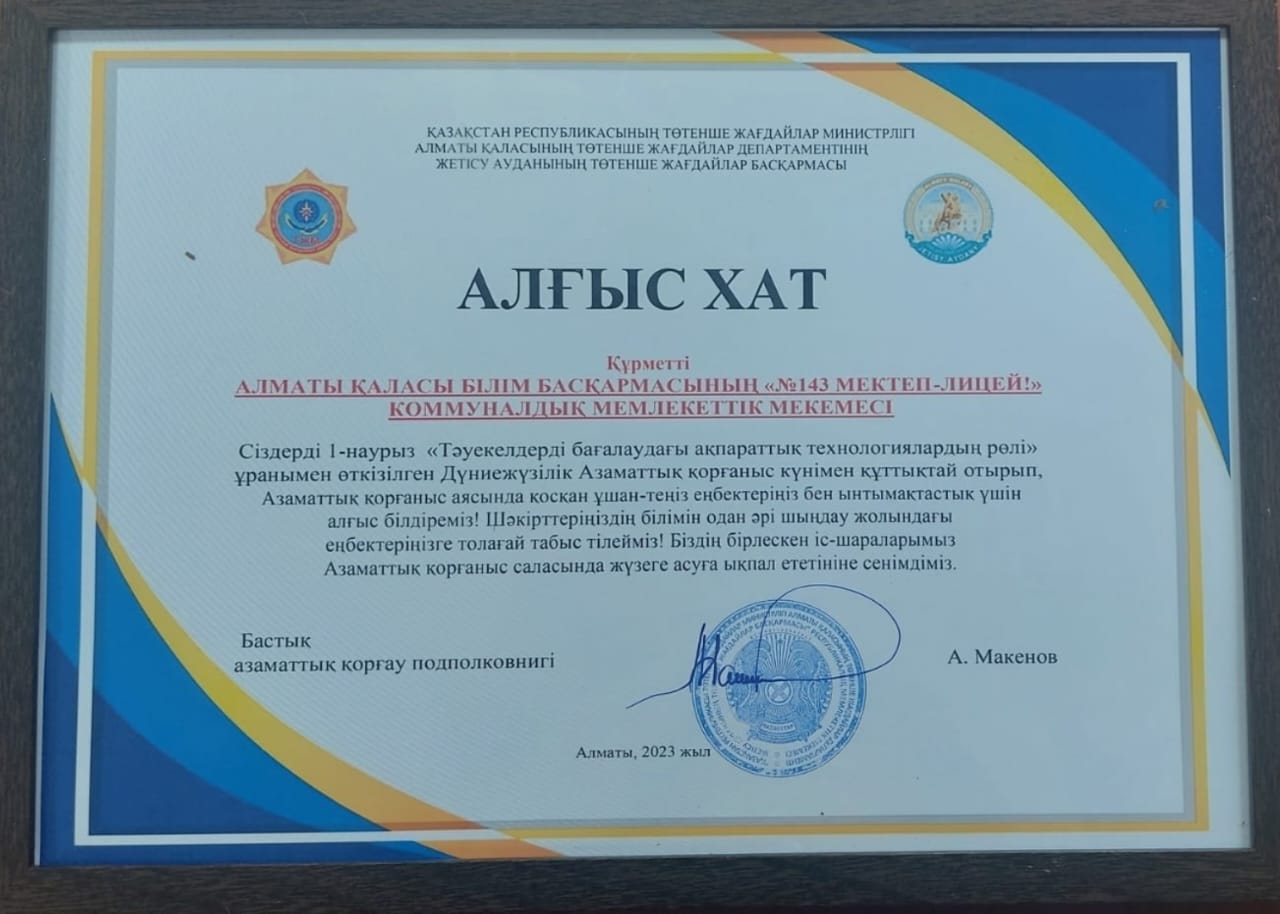 Жетісу ауданындағы Дүниежүзілік Азаматтық қорғаныс күніне орай «Тәуекелдерді бағалаудағы ақпараттық технологиялардың рөлі» ұранымен өткізілген ақпараттық-насихаттау іс-шараларға ат салысқаны үшін Алматы қаласы Білім басқармасының «№143 мектеп-лицейі» Жетісу ауданының төтенше жағдай департаментінің «Алғыс хатымен» марапатталды. ҚҰТТЫҚТАЙМЫЗ!!!
