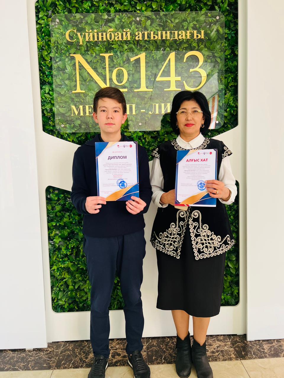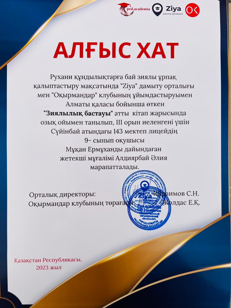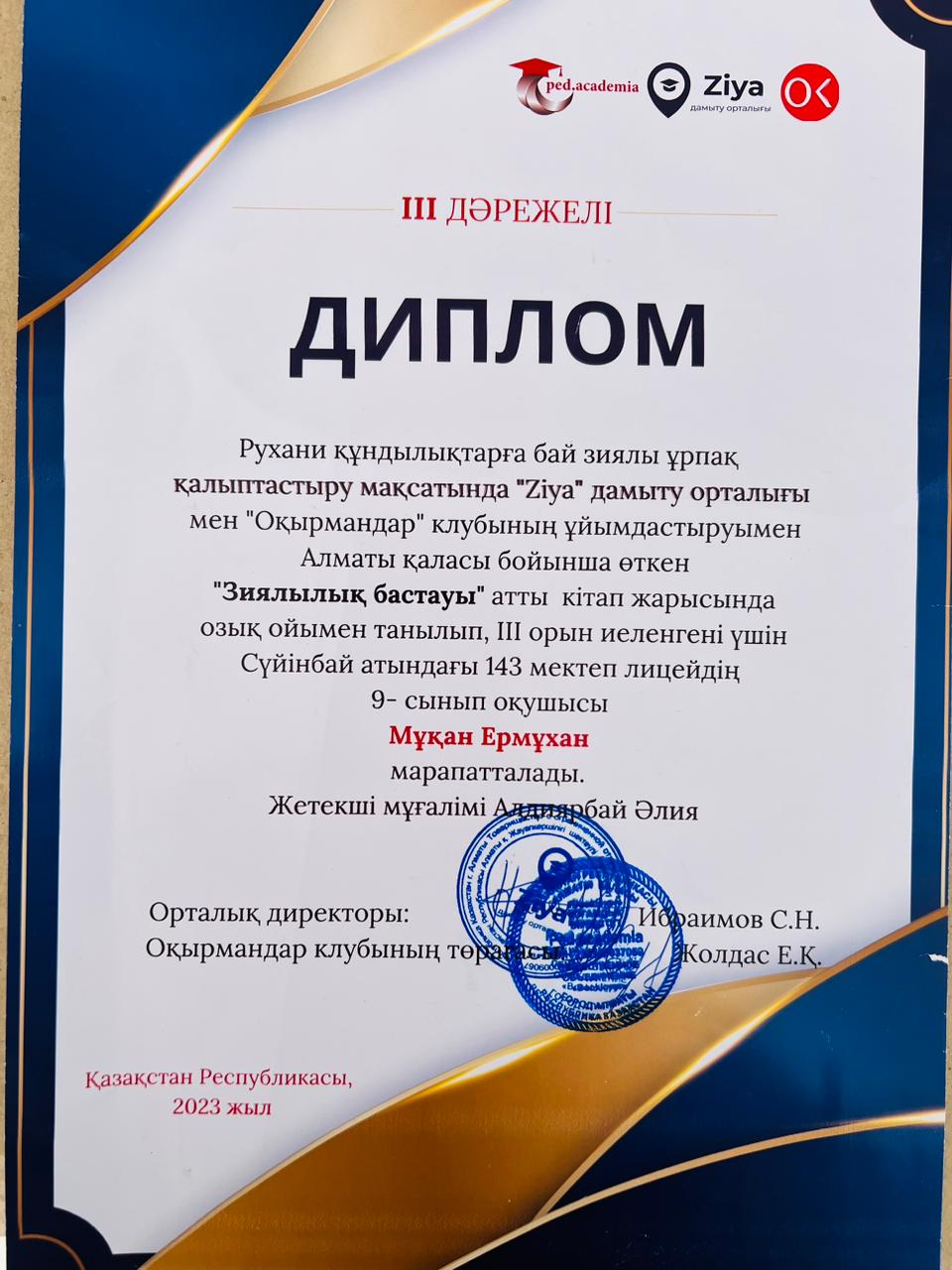 Рухани құндылықтарға бай зиялы ұрпақ қалыптастыру мақсатында "Ziya" дамыту орталығы мен "Оқырмандар" клубының ұйымдастыруымен Алматы қаласы бойынша өткен "Зиялылық бастауы" атты кітап кітап жарысында озық ойымен танылып, ІІІ орын иеленгені үшін Сүйінбай атындағы №143 мектеп-лицейдің 9 "Б" сынып оқушысы Мұқан Ермұхан дипломмен және жетекші мұғалімі Алдиярбай Әлия Алғыс хатпен марапатталды.