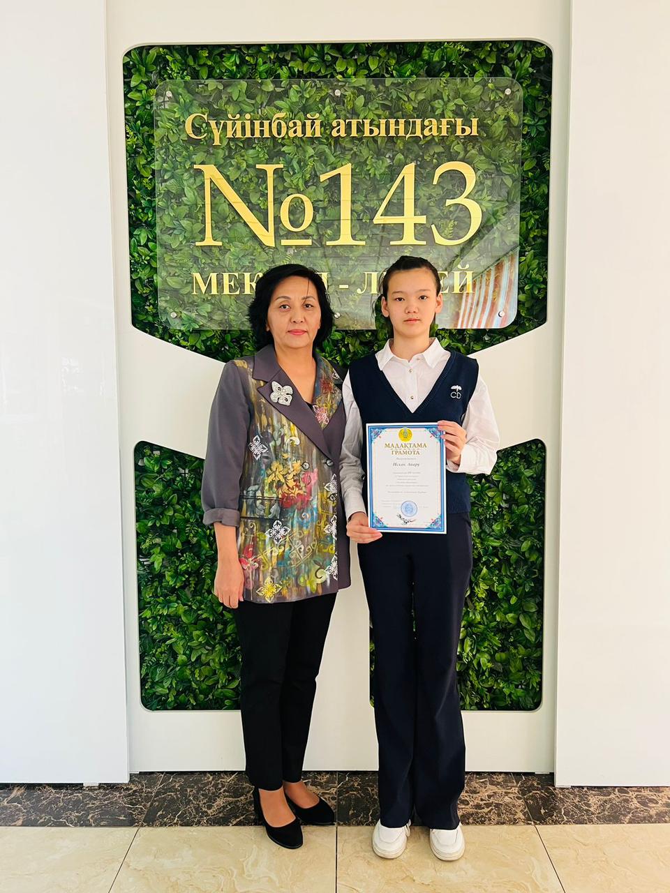 Алматы қаласы,Жетісу ауданы Сүйінбай атындағы #143 мектеп-лицейдің 8"Г" сынып оқушысы Искак Айару қазақ жазушыларының шығармалары бойынша "Листая страницы" атты қалалық балалардың сурет байқауында ІІІ орынға ие болды.Жетекшісі: