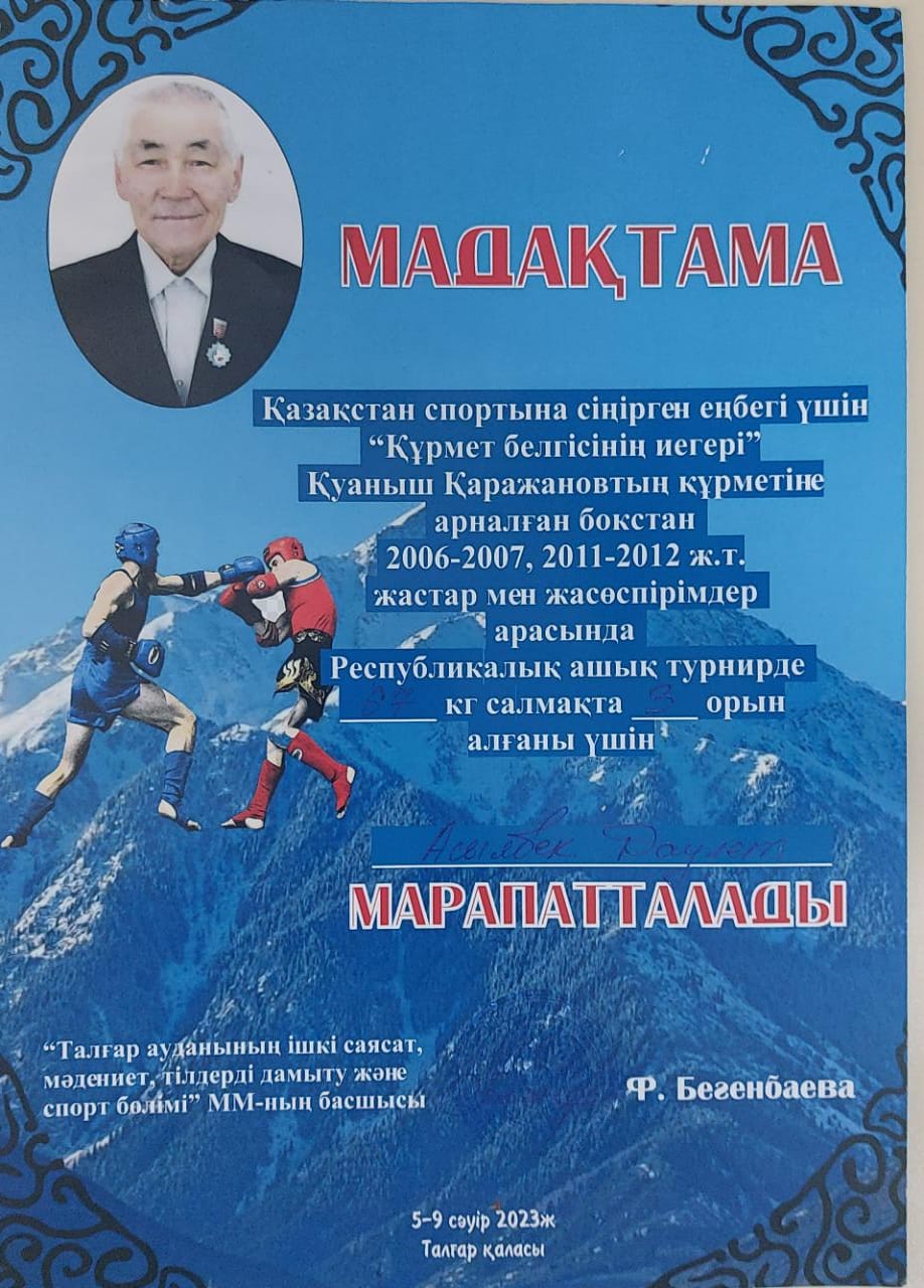 12 апрель 2023 0 1 2 3 4 5 9"А" сынып оқушысы Асылбек Дәулет Сүйінбай атындағы №143 мектеп- лицейдің 9"А" сынып оқушысы Асылбек Дәулет бокстан Талғар қаласында өткен Республикалық ашық турнирде ІІІ орын иеменді.Құттықтаймыз!💐💐💐 Осы беттің QR-коды:QR-код этой страницы:
