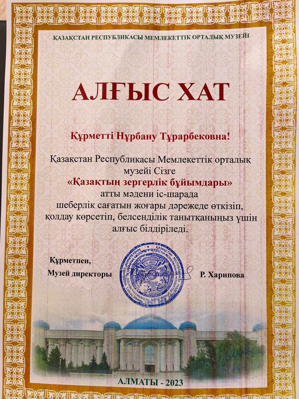 Сүйінбай атындағы #143 мектеп-лицейдің көркем еңбек пәнінің мұғалімі Алжанбаева Нұрбану Тұрарбекқызы Қазақстан Республикасының Орталық музейінде "Қазақстан зергерлік бұйымдары"атты мәдени іс-шарада шеберлік сағатын өткізіп,"Алғыс хатпен" марапатталды.