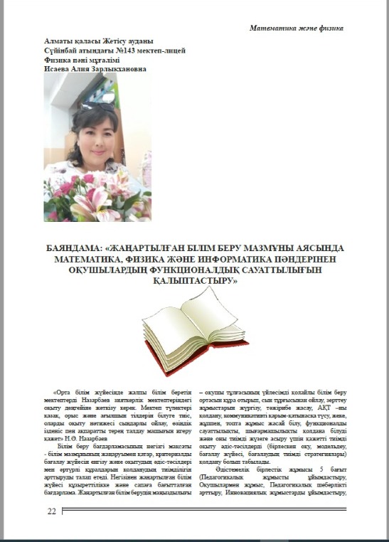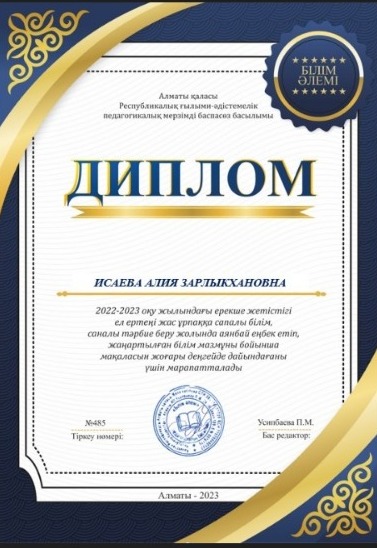 Сүйінбай атындағы №143 мектеп-лицейдің физика пәнінің мұғалімі Исаева Алия Зарлыкхановна 2022-2023 оқу жылындағы ерекше жетістігі ел ертеңі жас ұрпаққа сапалы білім, саналы тәрбие беру жолында аянбай еңбек етіп, жаңартылған білім мазмұны бойынша мақаласы жоғары деңгейде дайындағаны үшін дипломмен мараптталады.