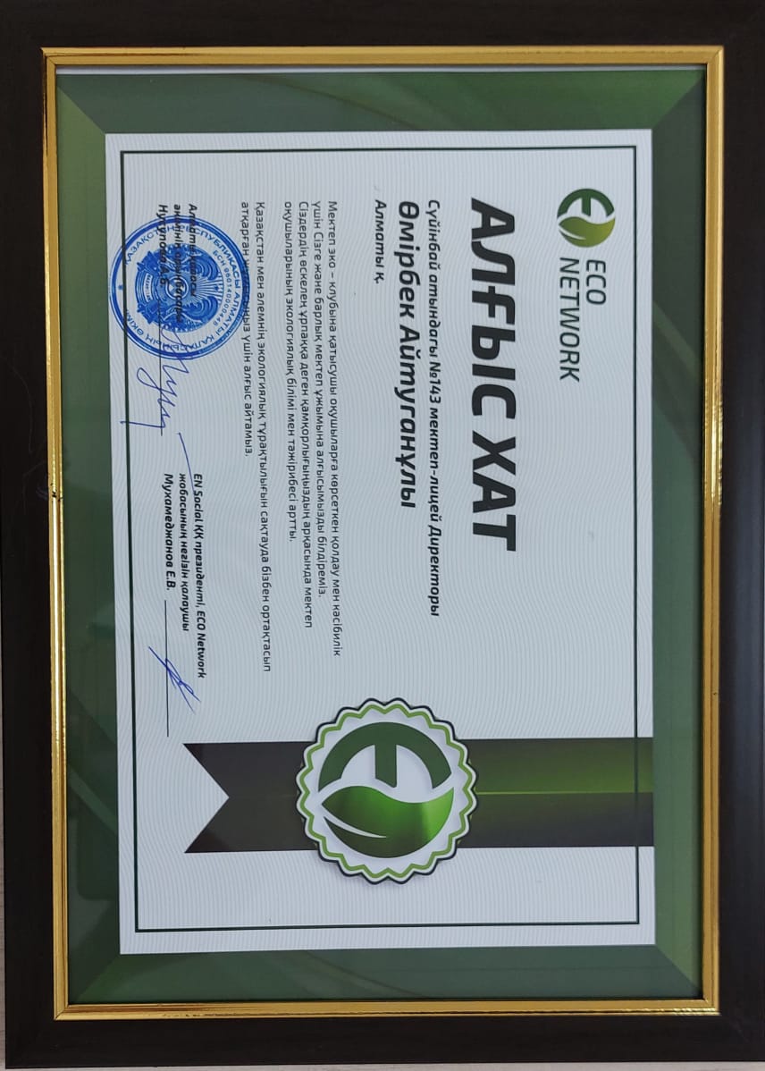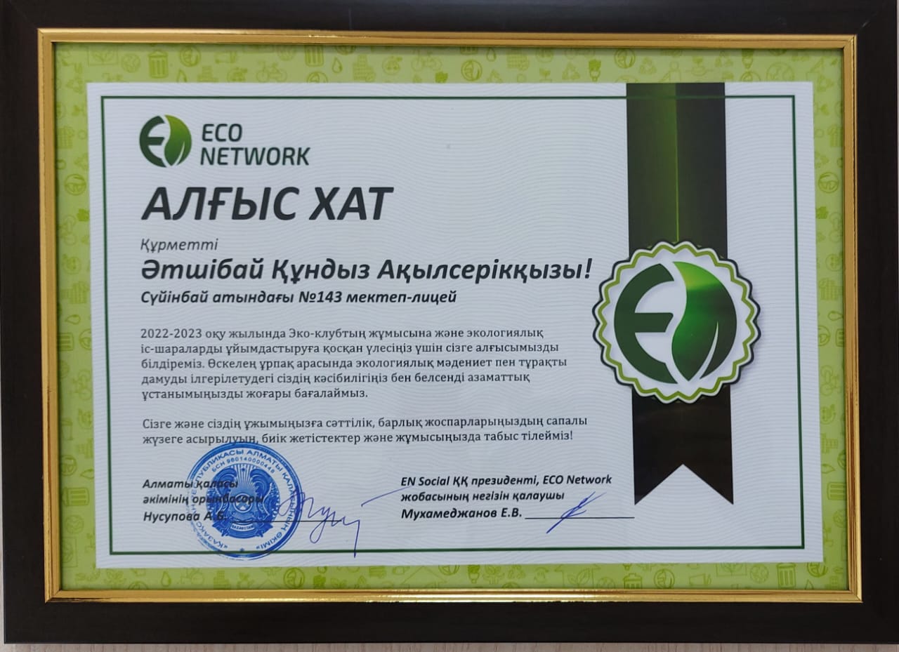 Алматы қаласы, Eco Network жобасының қорытынды жиынында эко клубтың жұмыстарын жоғары деңгейде ұйымдастырып, белсенділік танытқаны үшін, Сүйінбай атындағы мектеп-лицейдің директоры Өмірбек Айтуғанұлына және директордың тәрбие ісі жөніндегі орынбасары Әтшібай Құндыз Ақылсерікқызына Алғыс хат берілді
