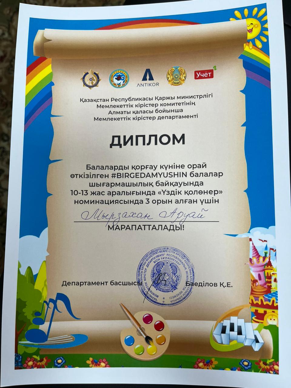 Қазақстан Республикасы Қаржы министрлігі Мемлекеттік кірістер комитетінің Алматы қаласы бойынша Мемлекеттік кірістер департаменті ұйымдастыруымен Балалар күніне орай өткізілген #BIRGEDAMYUSHIN балалар шығармашылық байқауында 10-13 жас аралығында "Үздік қолөнер" номинациясында 3 орын алған 8"в" сынып оқушысы Мырзахан Аруай бағалы сыйлық және дипломмен марапатталды. Жетекшісі:көркем еңбек пәнінің мұғалімі Алжанбаева Нурбану Турарбековна. Құттықтаймыз!💐💐💐💐💐