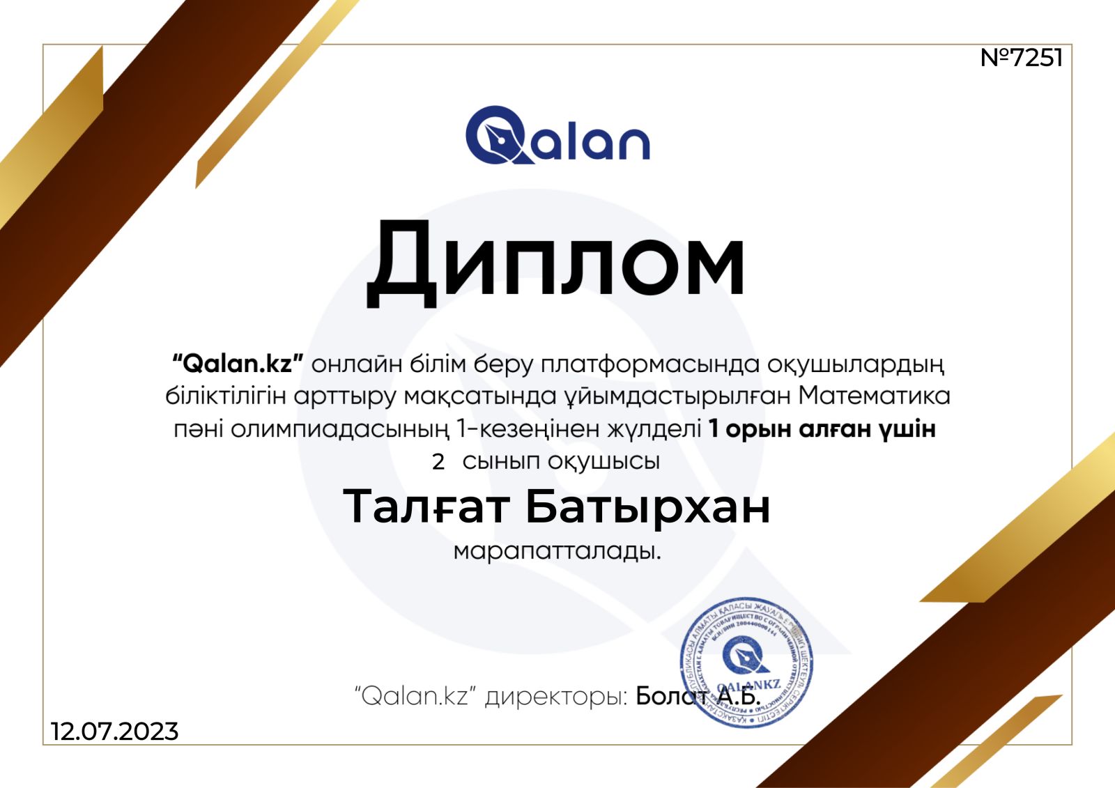 13 июль 2023 0 1 2 3 4 5 2 «Ә» сынып оқушысы Талғат Батырхан дипломмен марапатталды "Qalan.kz" онлайн білім беру платформасында оқушылардың біліктілігін арттыру мақсатында ұйымдастырылған Математика пәні олимпиадасының 1-кезеңінен жүлделі 1 орын алғаны үшін 2 «Ә» сынып оқушысы Талғат Батырхан дипломмен марапатталды. Осы беттің QR-коды:QR-код этой страницы: