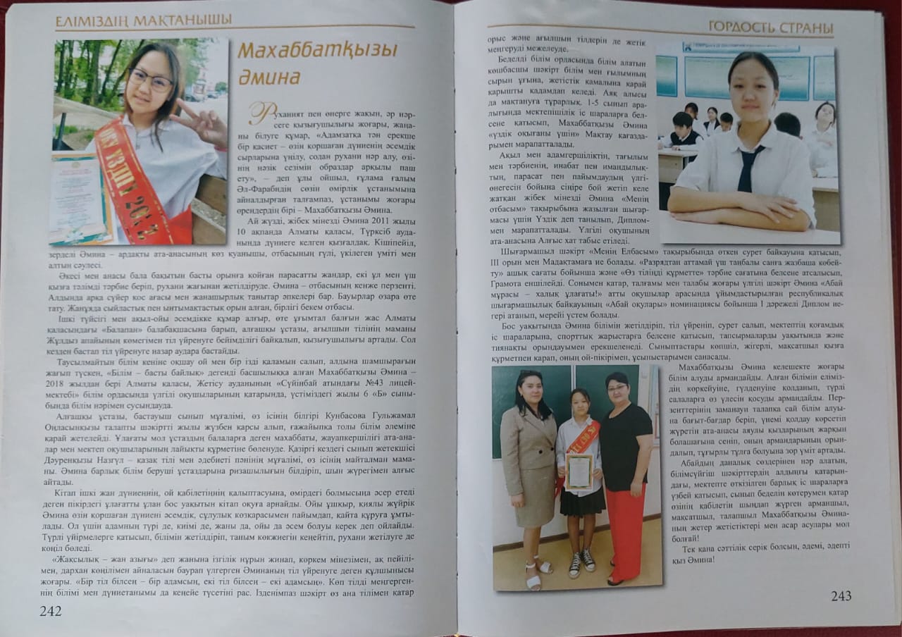 Сүйінбай атындағы мектеп-лицейдің 7 "Б" сынып оқушысы Махаббатқызы Әмина оқуда жеткен жетістерінің нәтижесінде Республикалық "ЕЛІМІЗДІҢ МАҚТАНЫШТАРЫ" жинағына еніп, АЛҒЫС ХАТПЕН марапатталды. Ол өзінің білім нәрімен сусындатқан ұстаздарына ризашылығын білдіріп, алғысын айтты.