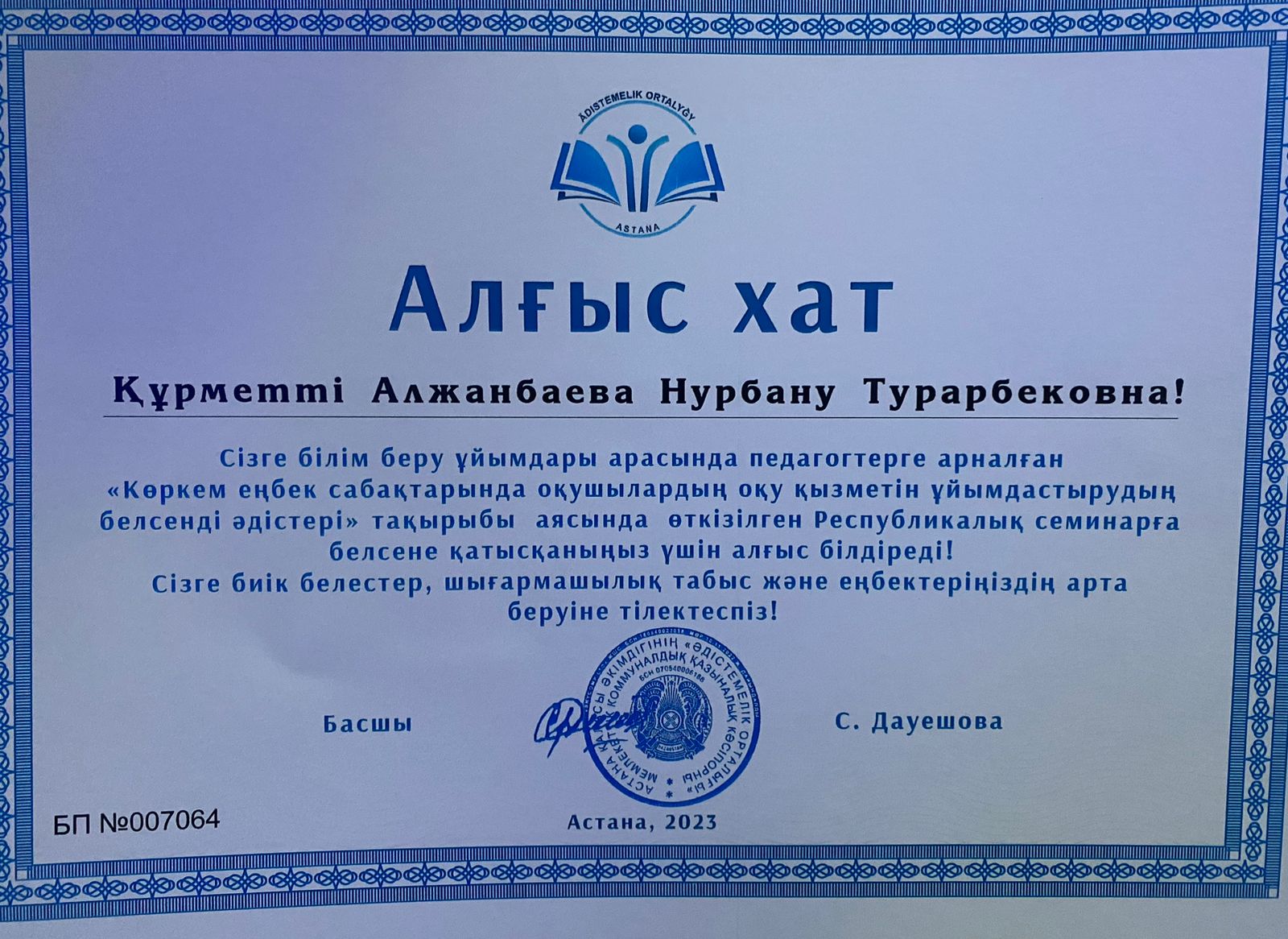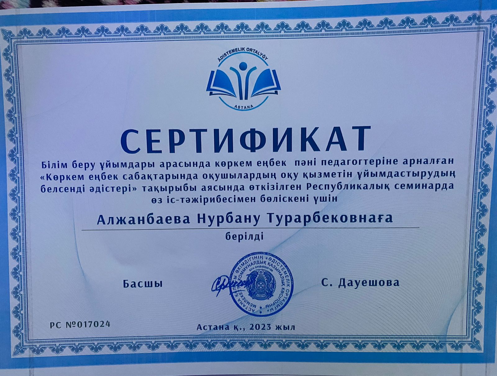 Білім беру ұйымдары арасында көркем еңбек пәні педагогтеріне арналған «көркем еңбек сабақтарында оқушылардың оқу қызметін ұйымдастырудың белсінді әдістері» тақырыбы аясында Астана қаласында өткен Республикалық семинарда Сүйінбай атындағы №143 мектеп-лицейдің көркем еңбек пәнінің мұғалімі Алжанбаева Нурбану Турарбековна өз іс-тәжірибесімен бөлісіп, шеберлік сабағын көрсетіп қайтты. Мектебіміздің ұстазымен мақтанамыз, әрі шығармашылық табыс тілейміз.