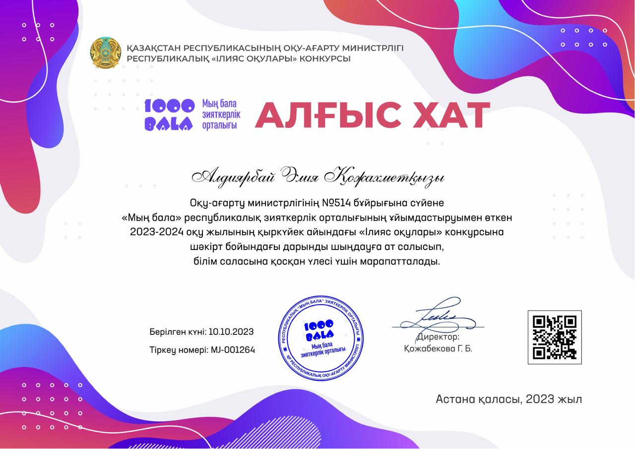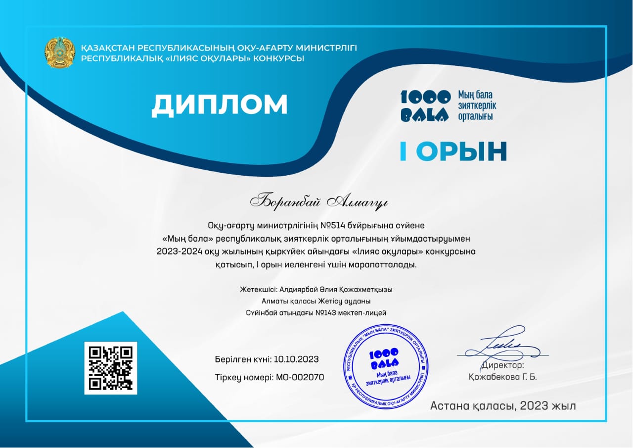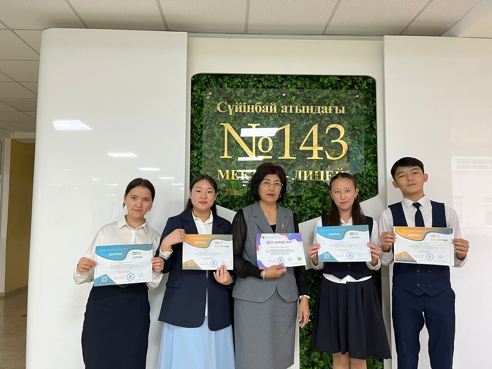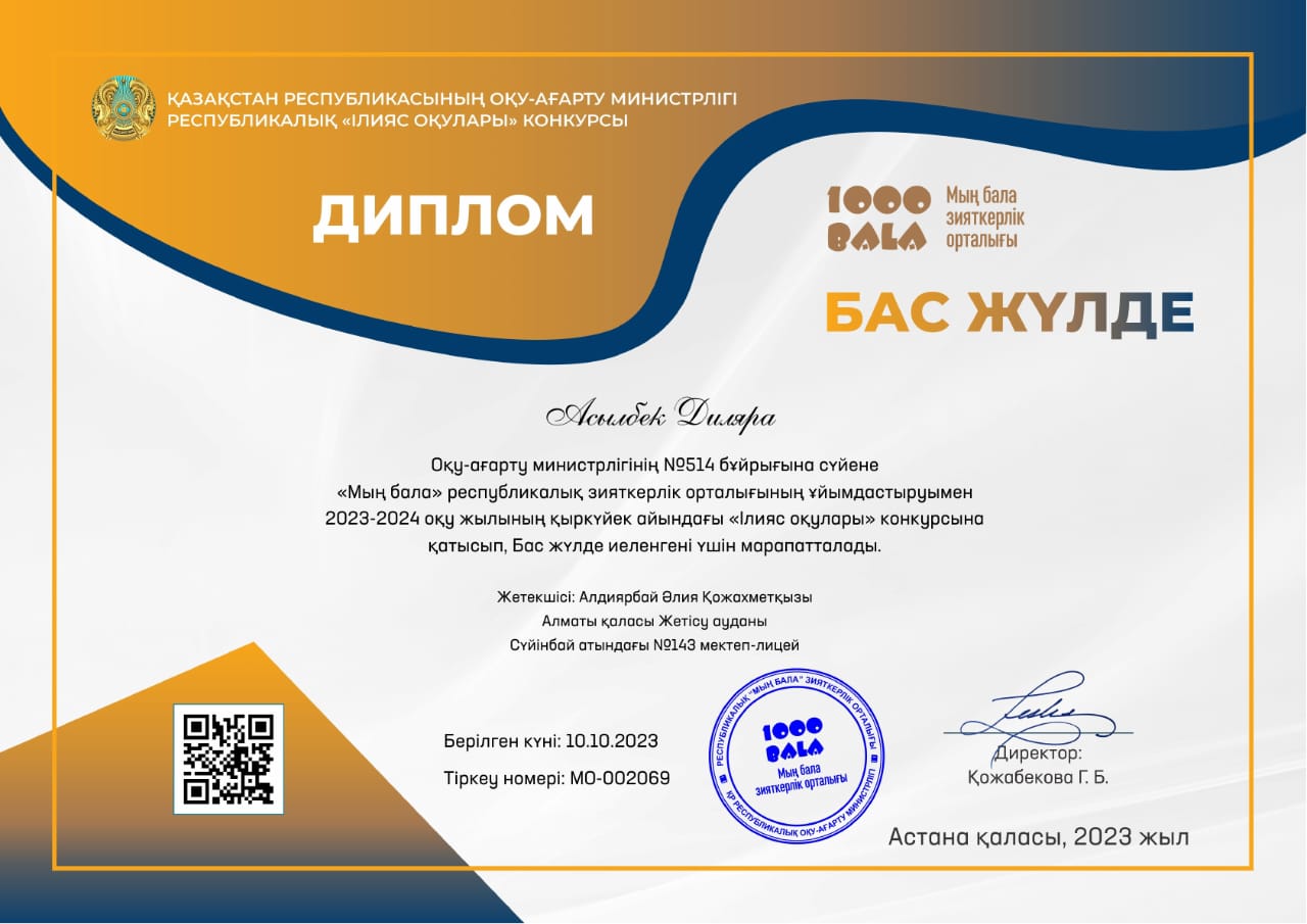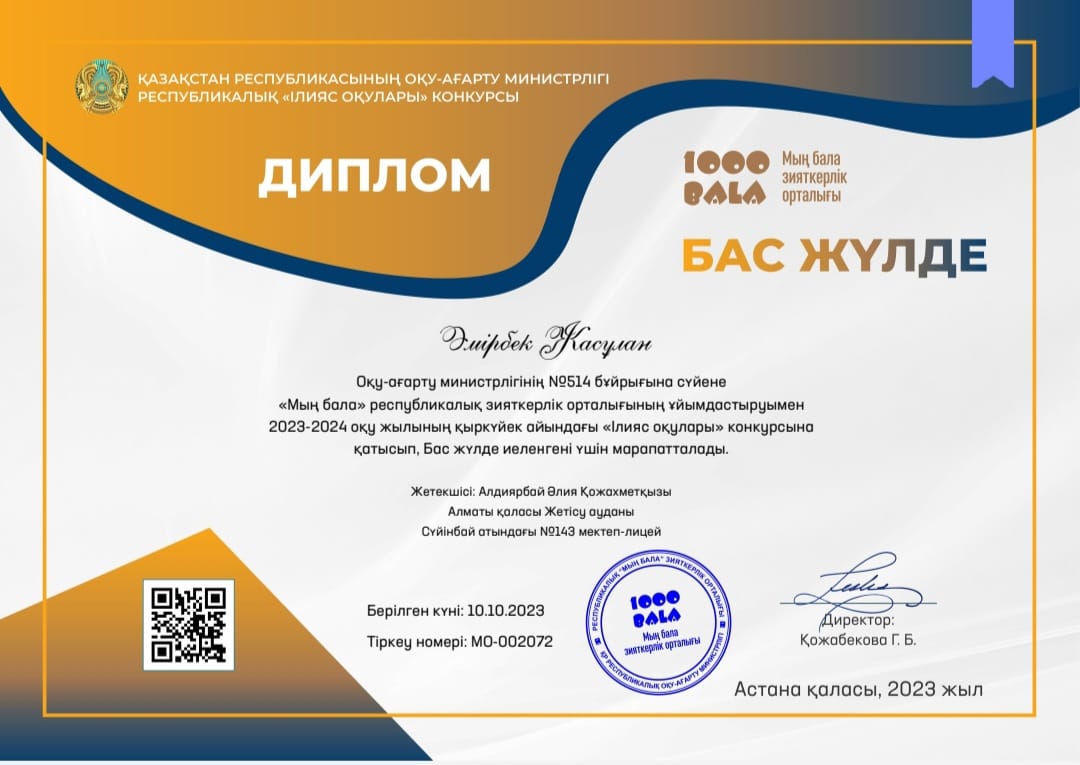 Оқу-ағарту министрлігінің №514 бұйрығына сүйене "Мың бала" республикалық зияткерлік орталығының ұйымдастыруымен 2023-2024 оқу жылының қыркүйек айындағы "Ілияс оқулары" конкурсына қатысып, Сүйінбай атындағы №143 мектеп-лицейдің 9 "В" сынып оқушылары Әмірбек Жасұлан, Асылбек Диляра Бас жүлде иеленгені үшін және Боранбай Алмагүл, Базарбай Диана І орын иеленгені үшін дипломмен марапатталды. Жетекшісі қазақ тілі мен әдебиеті пәнінің мұғалімі Алдиярбай Әлия Қожахметқызы Алғыс хатпен мараптталды💐💐