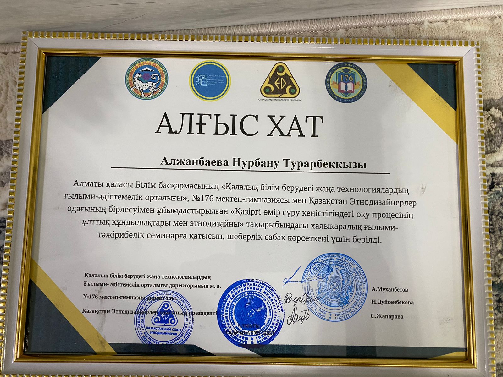 2023 жылдың 11 қарашасында Алматы қаласы Білім басқармасының «Қалалық білім берудегі жаңа технологиялардың ғылыми-әдістемелік орталығы», Наурызбай ауданы Білім басқармасы №176 мектеп-гимназиясы мен Қазақстан Этнодизайнерлер одағының ұйымдастыруымен қазақ халқының ұлттық құндылығы мен болмысын насихаттау мақсатында «Қазіргі өмір сүру кеңістігіндегі оқу процесінің ұлттық құндылықтары мен этнодизайны» атты халықаралық ғылыми-тәжірибелік семинар болып өтті.