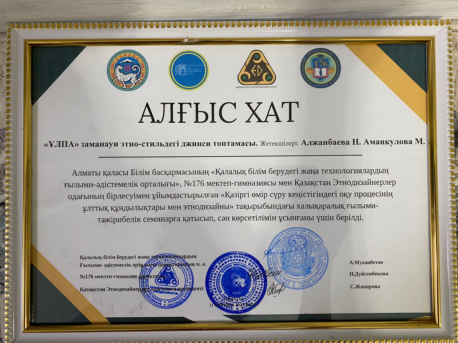 Осы аталған ауқымды іс-шараның жұмысын ұйымдастыруға белсене қатысып, шеберлік сабақтары мен «ҰЛПА» заманауи этно-стильдегі джинси топтамасы бойынша сән көрсетілімін жасап семинарға қатысушылардың зор қошеметіне ие болған Сүйінбай атындағы №143 мектеп-лицейдің көркем еңбек пәні мұғалімі, Қазақстан Этнодизайнерлер одағының мүшесі Алжанбаева Нұрбану Турарбековнаны мектеп-лицей ұжымы мақтан тұтады.