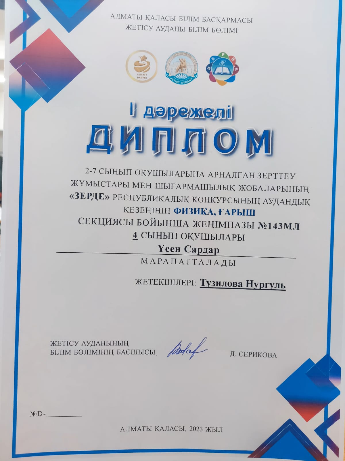2-7 сынып оқушыларына арналған зерттеу жұмыстары мен шығармашылық жобаларының "Зерде" Республикалық конкурсының аудандық кезеңінің химия, биология секциясы бойынша жүлдегері №143 мектеп-лицейдің 2 "Б" сынып оқушысы Үсен Сардар І дәрежелі дипломымен марапатталды. Жетекшісі бастауыш сынып мұғалімі Тузилова Нургуль 💐💐💐💐