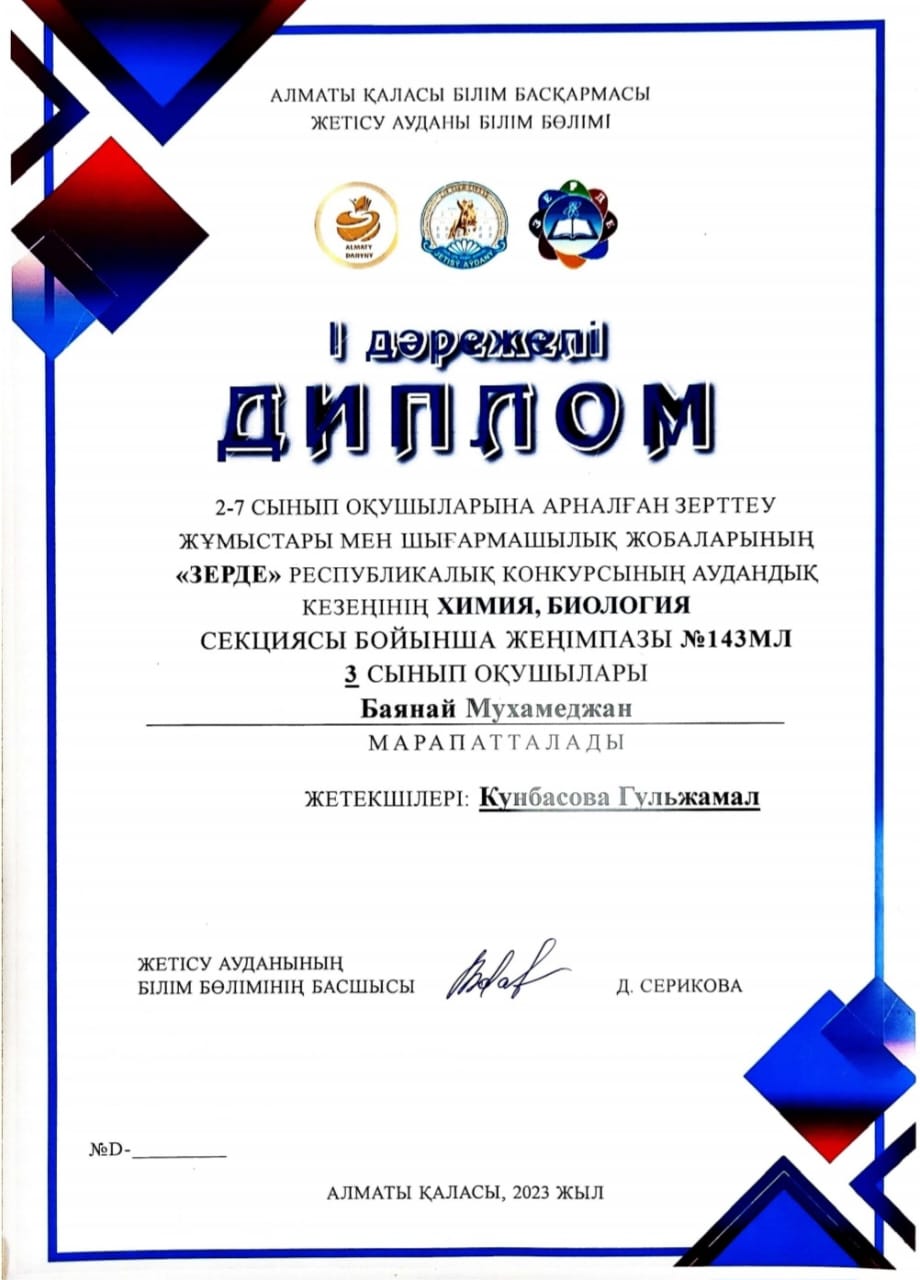 2-7 сынып оқушыларына арналған зерттеу жұмыстары мен шығармашылық жобаларының "Зерде" Республикалық конкурсының аудандық кезеңінің химия, биология секциясы бойынша жүлдегері №143 мектеп-лицейдің 3 "Ә" сынып оқушысы Баянай Мухамеджан І дәрежелі дипломымен марапатталды. Жетекшісі бастауыш сынып мұғалімі Кунбасова Гульжамал 💐💐💐💐