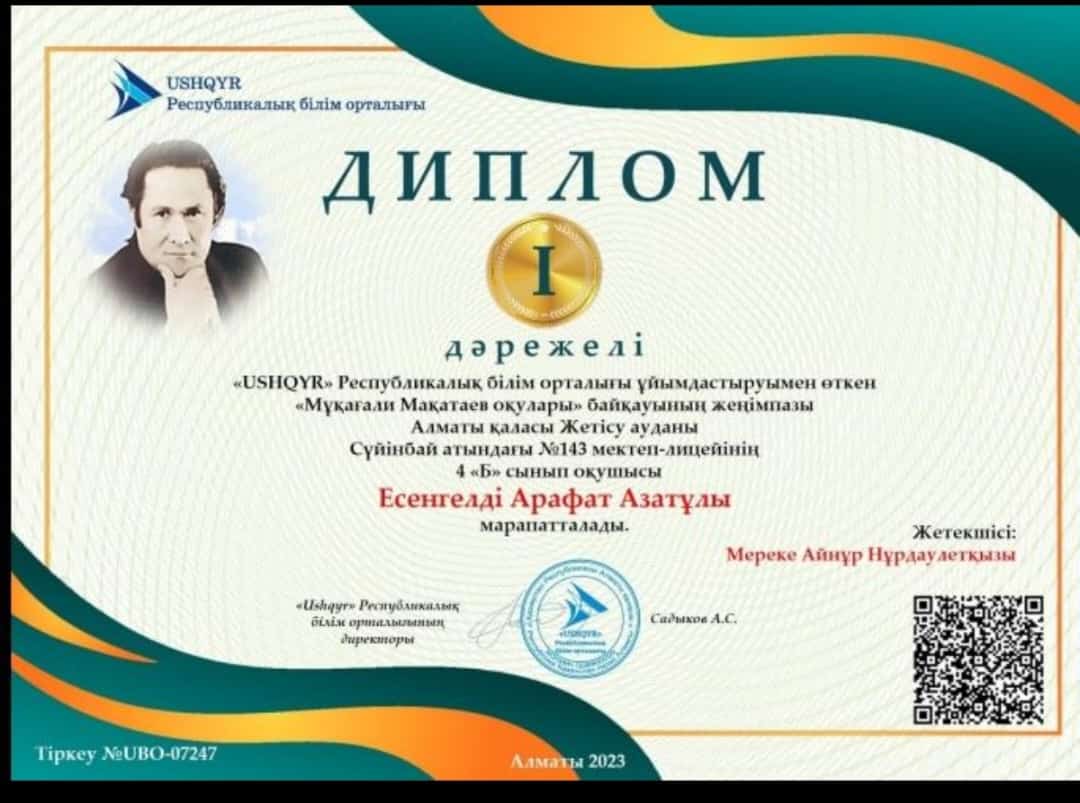 27 декабрь 2023 0 1 2 3 4 5 4"Б" сынып оқушысы Есенгелді Арафат "М.Мақатаев оқулары" байқауына қатысып 4"Б" сынып оқушысы Есенгелді Арафат 1 дәрежелі дипломмен марапатталды.Сынып жетекшісі Мереке Айнұр Нұрдәулетқызы. Осы беттің QR-коды:QR-код этой страницы: