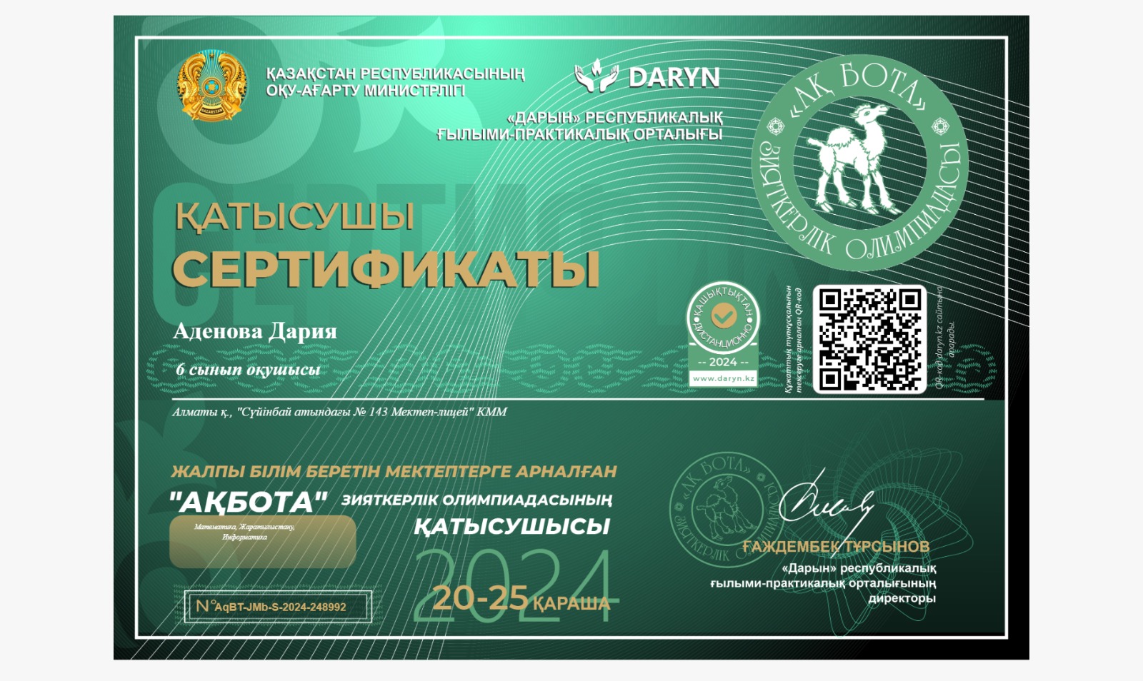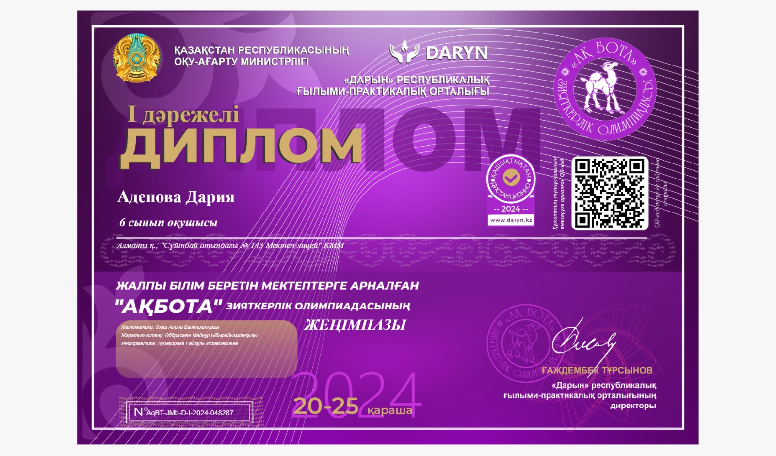 23 декабрь 2024 0 1 2 3 4 5 "Ақбота" зияткерлік олимпиадасы Сүйінбай атындағы №143 мектеп-лицейдің 6 сынып оқушысы Аденова Дария, Юлдашбай Исабек жалпы білім беретін мектептерге арналған "Ақбота" зияткерлік олимпиадасының І дәрежелі дипломмен марапатталды. Жетекшісі Әліш Алина Балтаханқызы Осы беттің QR-коды:QR-код этой страницы: