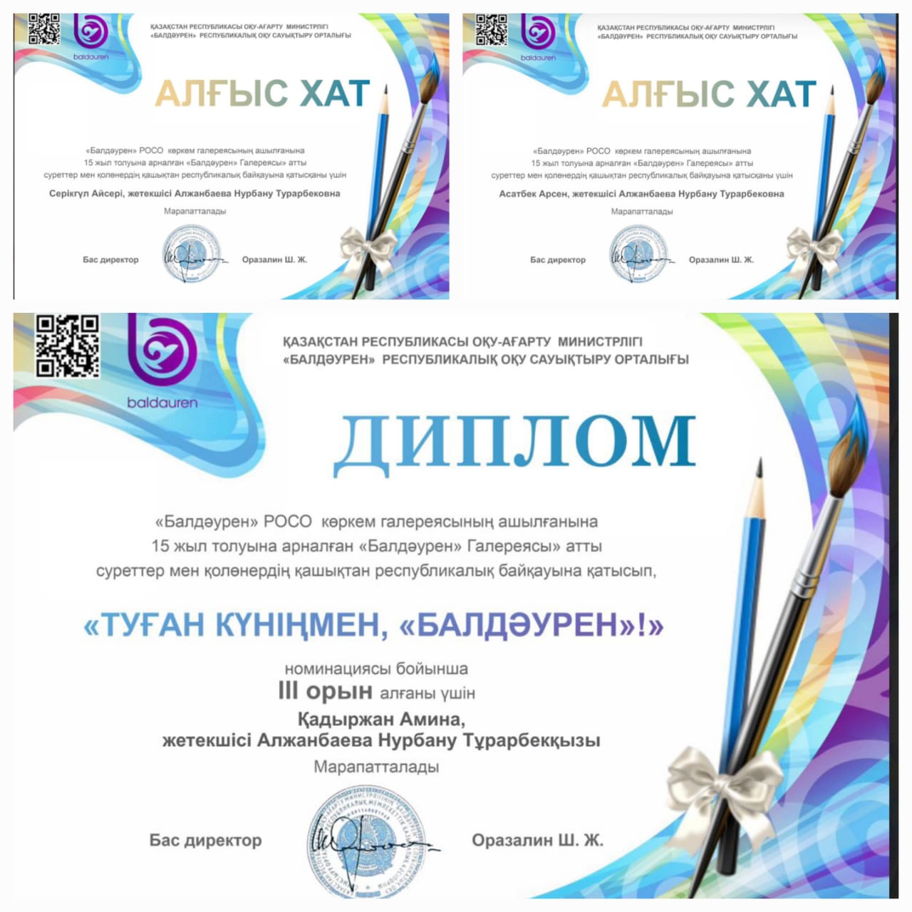 “Балдаурен” РОСО көркем галереясының ашылғанына 15-жыл толуына арналған “Балдаурен Галереясы” атты суреттер мен қолөнердің қашықтан республикалық байқауы 9”г” сынып оқушысы Қадыржан Әмина жүлделі 3-ші орын алды.