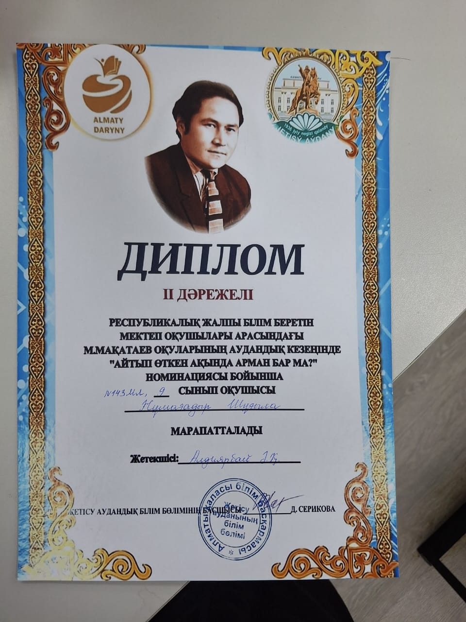 ІІ дәрежелі дипломын Сүйінбай атындағы № 143 мектеп-лицейінің 9 “Б” сынып оқушысы Жұмағадыр Шұғыла жеңіп алды.