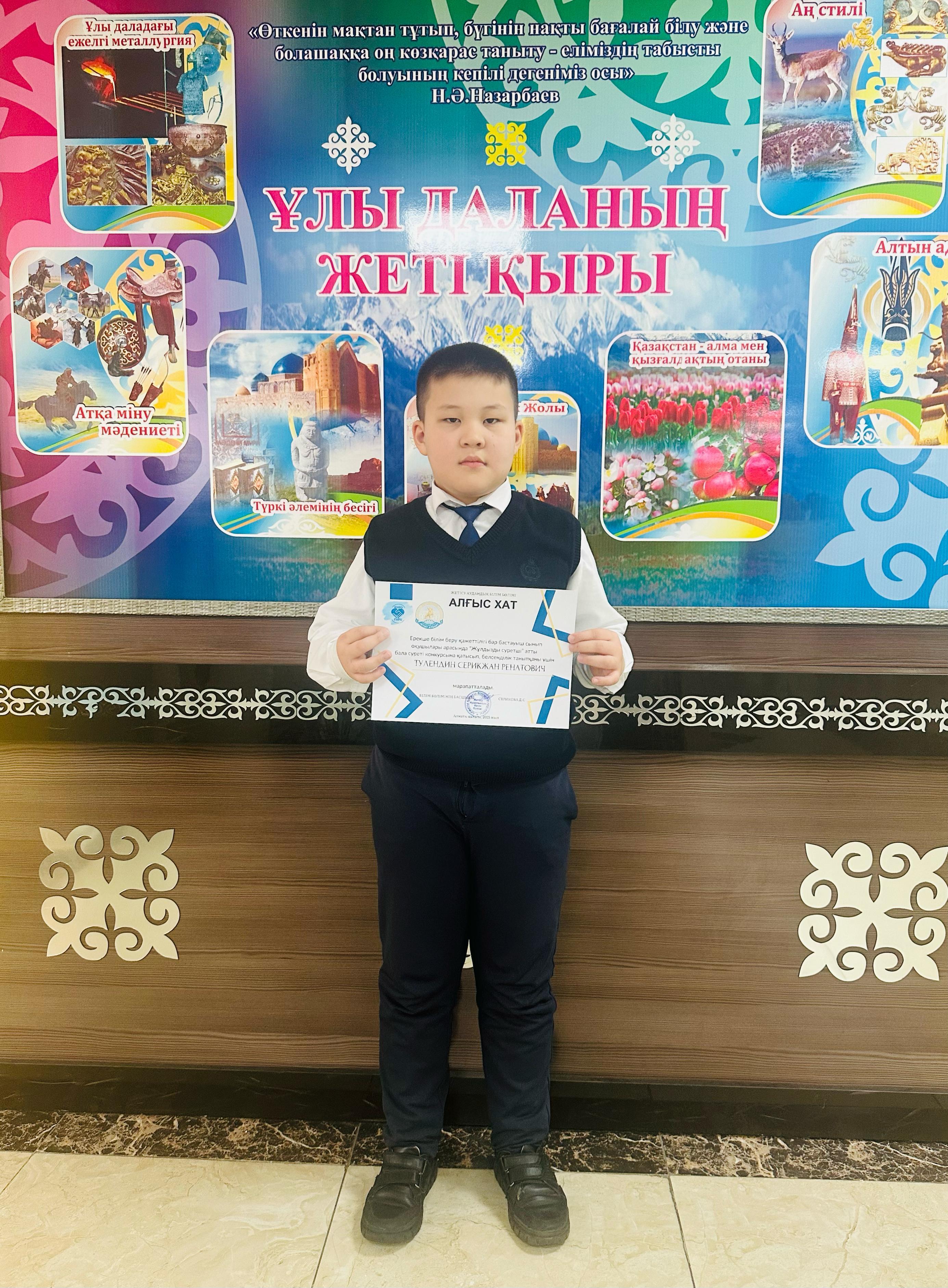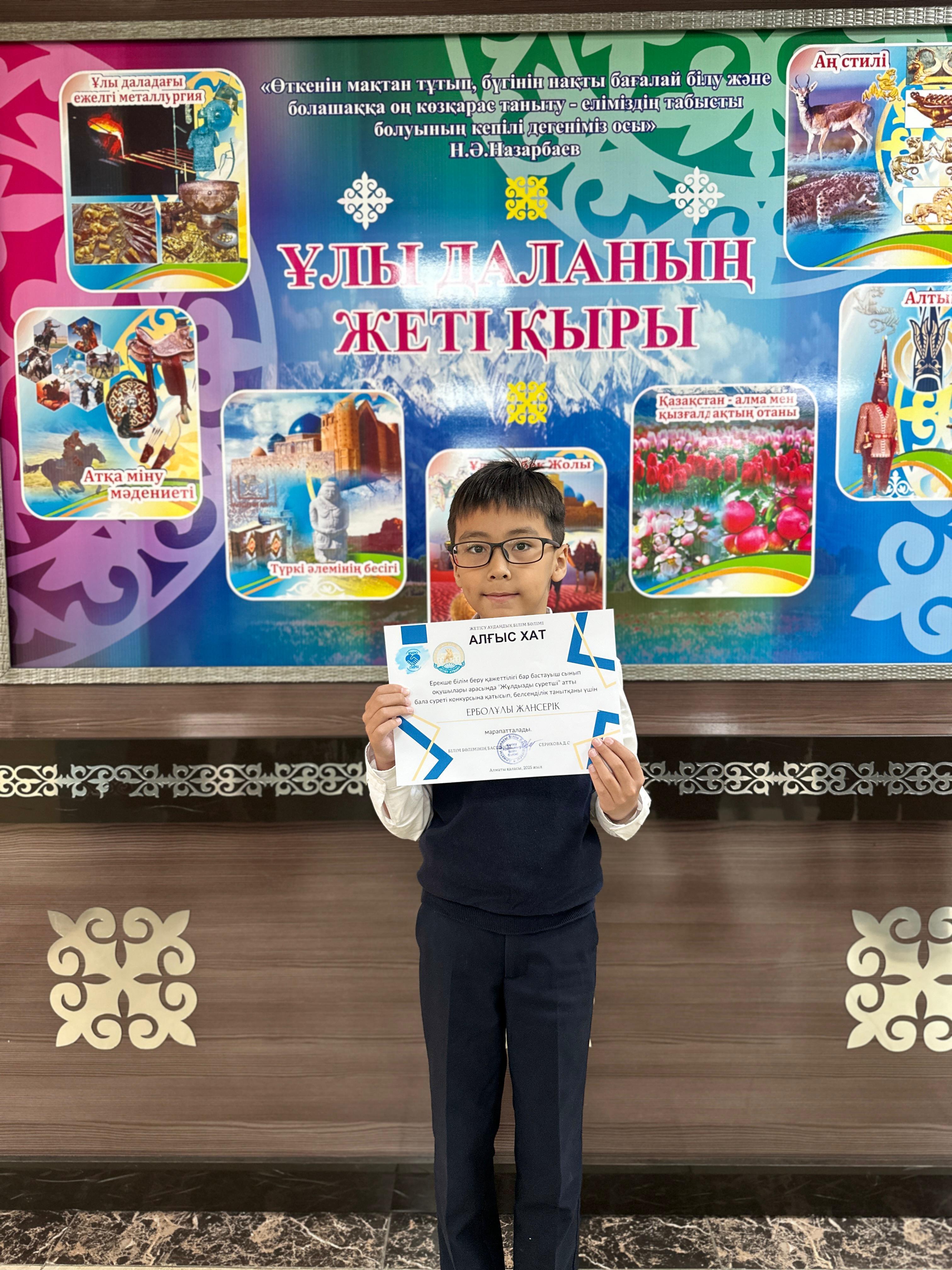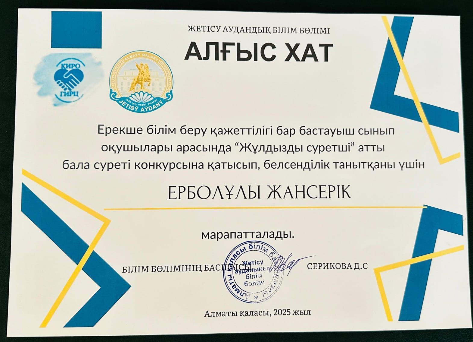 4«В»сынып оқушысы Ержан Ералы қатысып, белсенділік танытқаны үшін алғыс хатпен марапатталды.