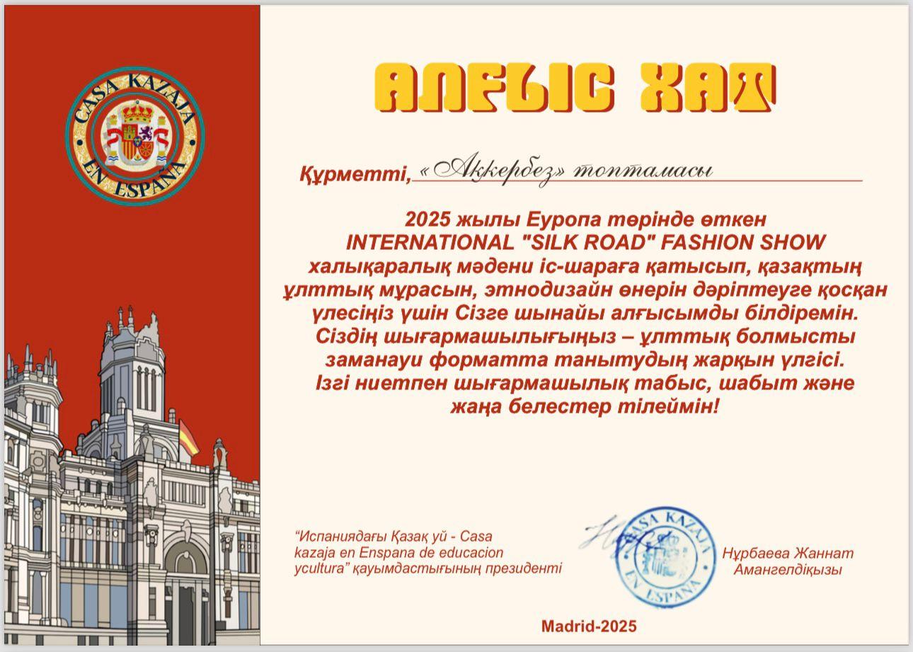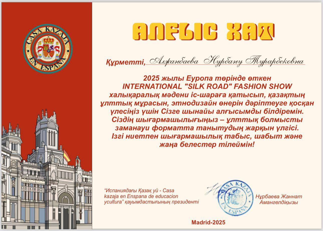 Испанияның астанасы Мадрид қаласында Қазақстан Республикасының Испаниядағы Елшілігінің қолдауымен Қазақстандық Этнодизайнерлер Одағы делегациясы халықаралық мәдени және сән шарасына қатысып, ұлттық өнерімізді жоғары деңгейде таныстырды.
